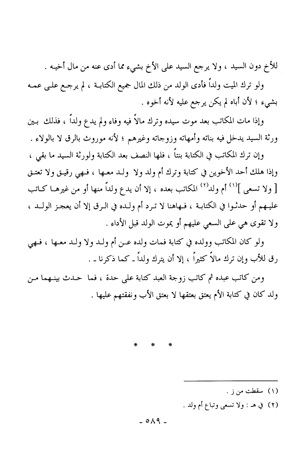 2161 - ولو ترك الميت ولداً فأدى الولد من ذلك المال جميع الكتابة، لم يرجع على عمه بشيء، لأن أباه لم يكن يرجع عليه لأنه أخوه، وإذا مات المكاتب بعد موت سيده وترك مالاً فيه وفاء ولم يدع ولداً، فذلك بين ورثة السيد يدخل فيه بناته وأمهاته وزوجاته وغيرهم، لأنه موروث بالرق لا بالولاء.