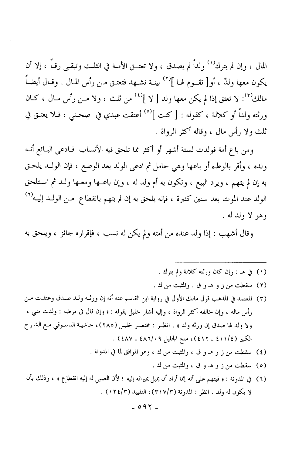 المال، وإن لم يترك ولداً لم يصدق، ولا تعتق الأمة في الثلث وتبقى رقاً، إلا أن يكون معها ولد، أو [تقوم لها] بينة تشهد فتعتق من رأس المال. وقال أيضاً مالك: لا تعتق إذا لم يكن معها ولد [لا] من ثلث، ولا من رأس مال، كان ورثته ولداً أو كلالة، كقوله: [كنت] أعتقت عبدي في صحتي، فلا يعتق في ثلث ولا رأس مال، وقاله أكثر الرواة.