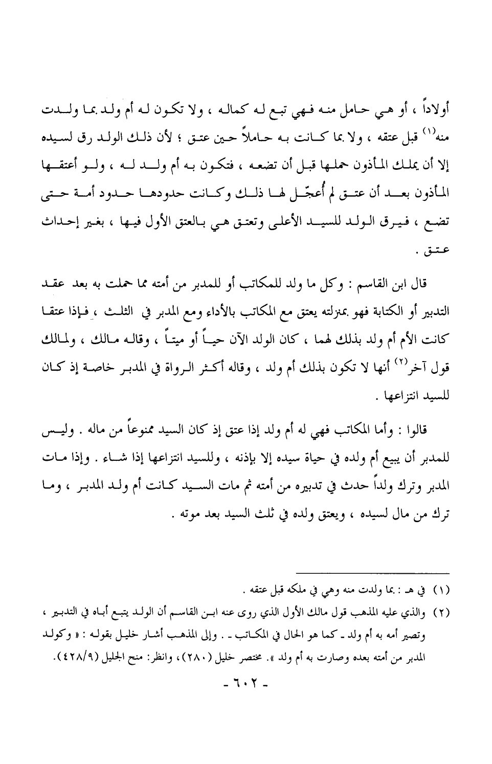 قالوا: وأما المكاتب فهي له أم ولد إذا عتق إذ كان السيد ممنوعاً من ماله. وليس للمدبر أن يبيع أم ولده في حياة سيده إلابإذنه، وللسيد انتزاعها إذا شاء. وإذا مات المدبر وترك ولداً حدث في تدبيره من أمته ثم مات السيد كانت أم ولد المدبر، وما ترك من مال لسيده، ويعتق ولده في ثلث السيد بعد موته.