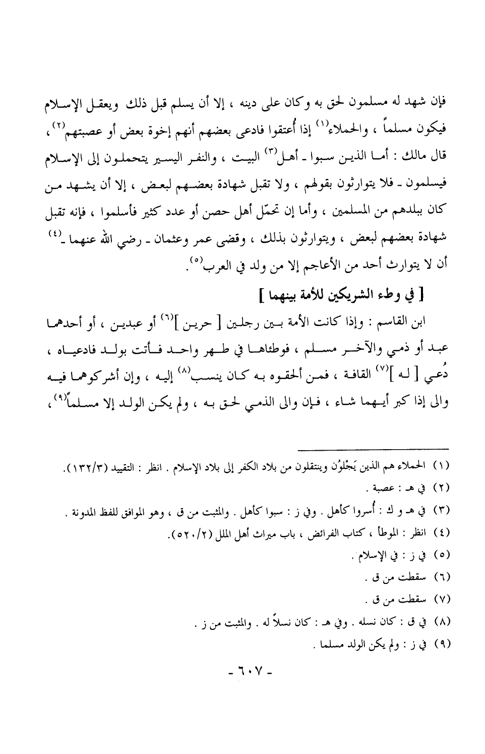 فإن شهد له مسلمون لحق به وكان على دينه، إلا أن يسلم قبل ذلك ويعقل الإسلام فيكون مسلماً، والحملاء إذا أُعتقوا فادعى بعضهم أنهم إخوة بعض أو عصبتهم، قال مالك: أما الذين سبوا - أهل البيت، والنفر اليسير يتحملون إلى الإسلام فيسلمون - فلا يتوارثون بقولهم، ولا تقبل شهادة بعضهم لبعض، إلا أن يشهد من كان ببلدهم من المسلمين، وأما إن تحمّل اهل حصن أو عدد كثير فأسلموا، فإنه تقبل شهادة بعضهم لبعض، ويتوارثون بذلك، وقضى عمر وعثمان - رضي الله عنهما - أن لا يتوارث أحد من الأعاجم إلا من ولد في العرب.