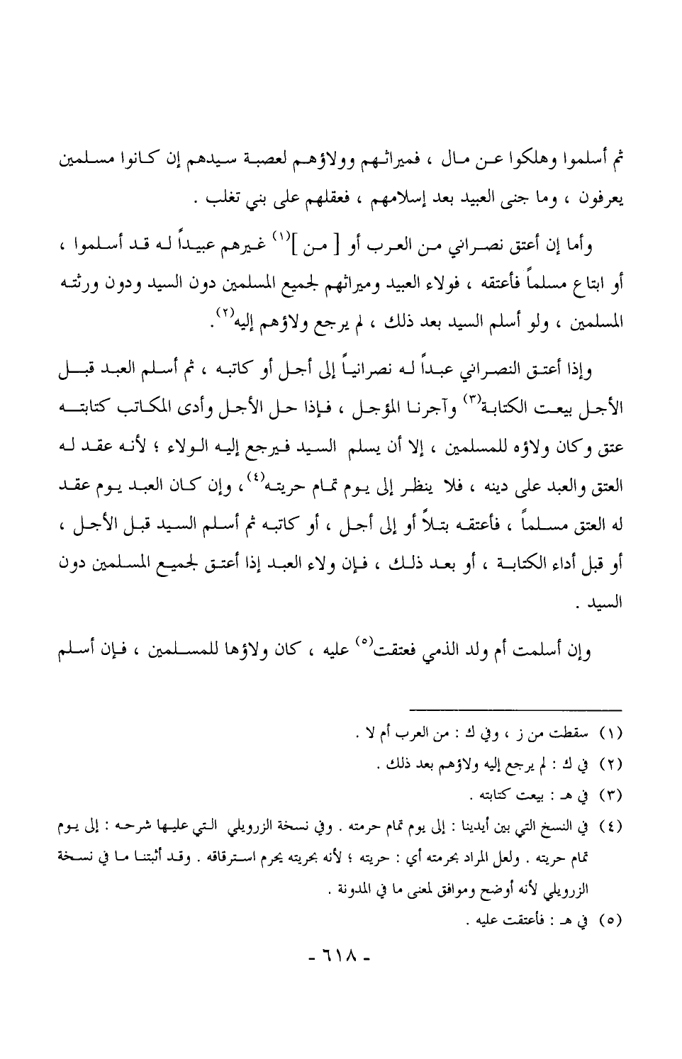 2200 - وإذا أعتق النصراني عبداً له نصرانياً إلى أجل أو كاتبه، ثم أسلم العبد قبل الأجل بيعت الكتابة وآجرنا المؤجل، فإذا حل الأجل وأدى المكاتب كتابته عتق وكان ولاؤه للمسلمين، إلا أن يسلم السيد فيرجع إليه الولاء، لأنه عقد له العتق والعبد على دينه، فلا ينظر إلى يوم تمام حريته، وإن كان العبد يوم عقد له العتق مسلماً، فأعتقه بتلاً أو إلى أجل، أو كاتبه ثم أسلم السيد قبل الأجل، أو قبل أداء الكتابة، أو بعد ذلك، فإن ولاء العبد إذا أعتق لجميع المسلمين دون السيد.