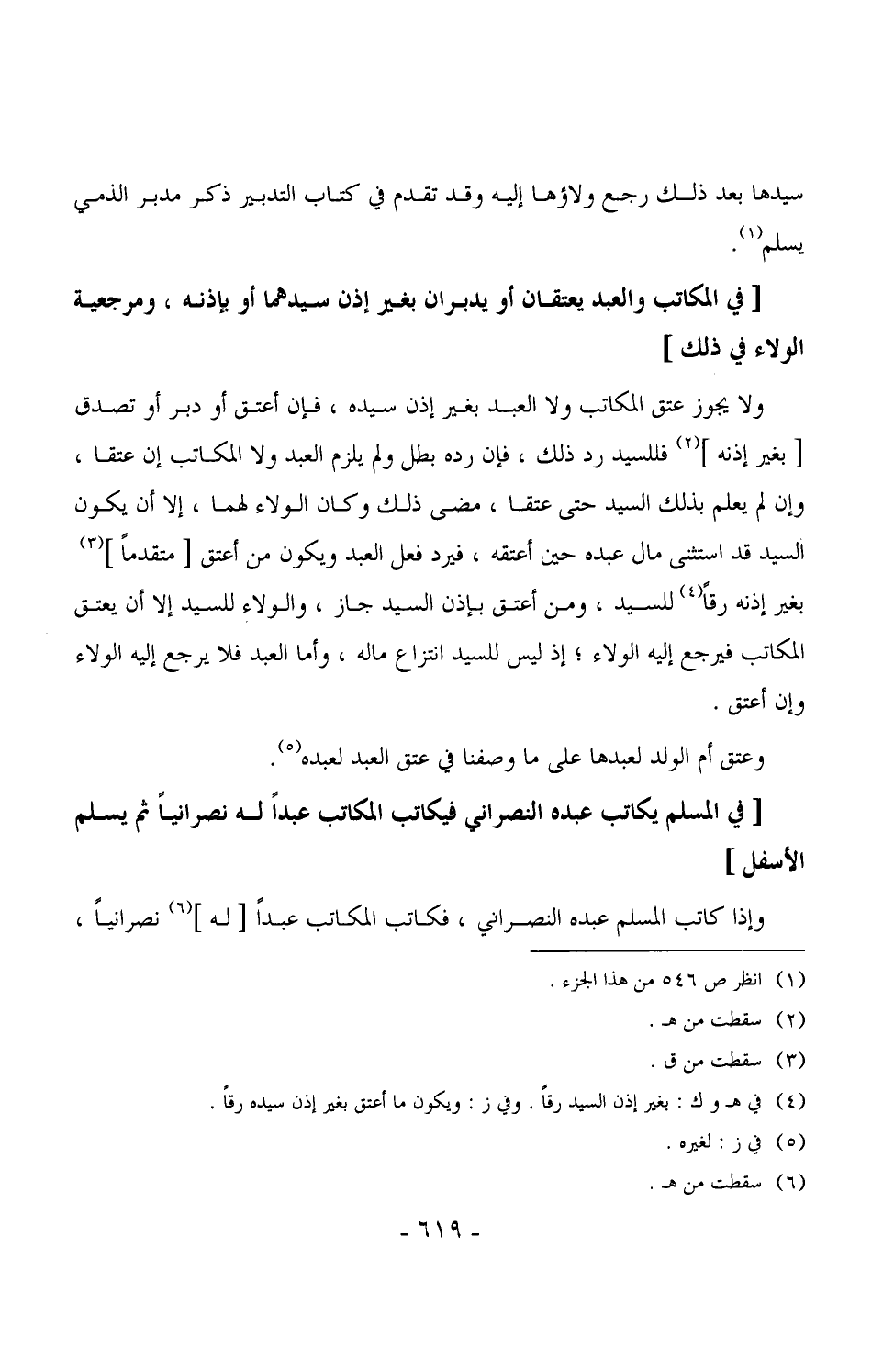 2201 - ولا يجوز عتق المكاتب ولا العبد بغير إذن سيده، فإن أعتق أو دبر أو تصدق [بغير إذنه] فللسيد رد ذلك، فإن رده بطل ولم يلزم العبد ولا المكاتب إن عتقا، وإن لم يعلم بذلك السيد حتى عتقا، مضى ذلك وكان الولاء لهما، إلا أن يكون السيد قد استثنى مال عبده حين أعتقه، فيرد فعل العبد ويكون من أعتق [متقدماً] بغير إذنه رقاً للسيد، ومن أعتق بإذن السيد جاز، والولاء للسيد إلا أن يعتق المكاتب فيرجع إليه الولاء، إذ ليس للسيد انتزاع ماله، وأما العبد فلا يرجع إليه الولاء وإن أعتق.