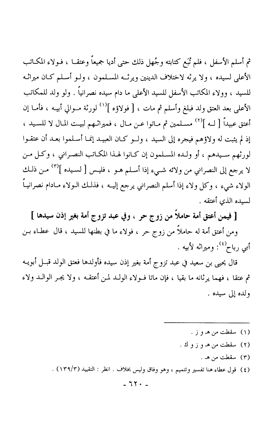 ثم أسلم الأسفل، فلم تُبع كتابته وجُهل ذلك حتى أديا جميعاً وعتقا، فولاء المكاتب الأعلى لسيده، ولا يرثه لاختلاف الدينين ويرثه المسلمون، ولو أسلم كان ميراثه للسيد، وولاء المكاتب الأسفل للسيد الأعلى ما دام سيده نصرانياً. ولو ولد للمكاتب الأعلى بعد العتق ولد فبلغ وأسلم ثم مات، [فولاؤه] لورثة موالي أبيه، فأما إن أعتق عبيداً [له] مسلمين ثم ماتوا عن مال، فميراثهم لبيت المال لا للسيد، إذ لم يثبت له ولاؤهم فيجره إلى السيد، ولو كان العبيد إنما أسلموا بعد أن عتقوا لورثهم سيدهم، أو ولده المسلمون إن كانوا لهذا المكاتب النصراني، وكل من لا يرجع إلى النصراني من ولائه شيء إذا أسلم هو، فليس [لسيده] من ذلك الولاء شيء، وكل ولاء إذا أسلم النصراني يرجع إليه، فذلك الولاء ما دام نصرانياً لسيده الذي أعتقه.