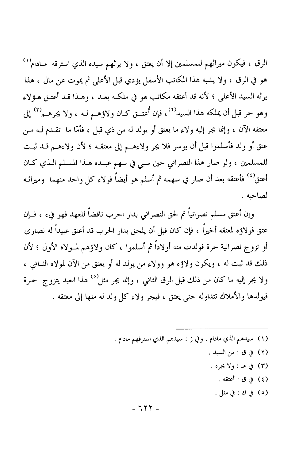 الرق، فيكون ميراثهم للمسلمين إلا أن يعتق، ولا يرثهم سيده الذي استرقه ما دام هو في الرق، ولا يشبه هذا المكاتب الأسفل يؤدي قبل الأعلى ثم يموت عن مال، هذا يرثه السيد الأعلى، لأنه قد أعتقه مكاتب هو في ملكه بعد، وهذا قد أعتق هؤلاء وهو حر قبل أن يملكه هذا السيد، فإن أُعتق كان ولاؤهم له، ولا يجرهم إلى معتقه الآن، وإنما يجر إليه ولاء ما يعتق أو يولد له من ذي قبل، فأما ما تقدم له من عق أو ولد فأسلموا قبل أن يوسر فلا يجر ولاءهم إلى معتقه، لأن ولاءهم قد ثبت للمسلمين، ولو صار هذا النصراني حين سبي في سهم عبده هذا المسلم الذي كان أعتق فأعتقه بعد أن صار في سهمه ثم أسلم هو أيضاً فولاء كل واحد منهما وميراثه لصاحبه.