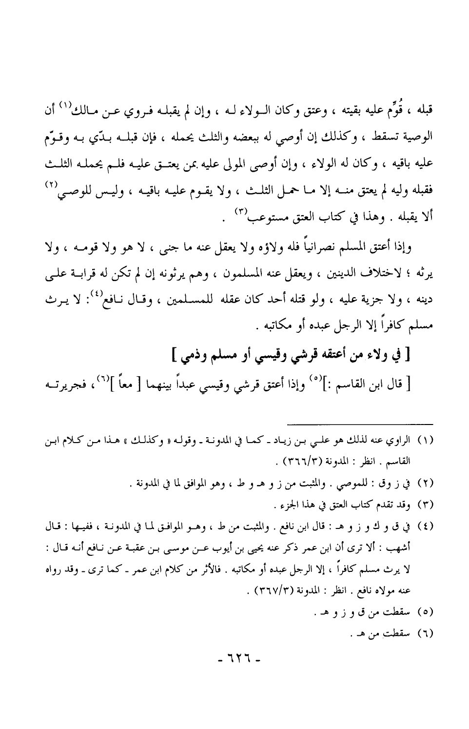 2213 -[قال ابن القاسم:] وإذا أعتق قرشي وقيسي عبداً بينهما [معاً] ، فجريرته