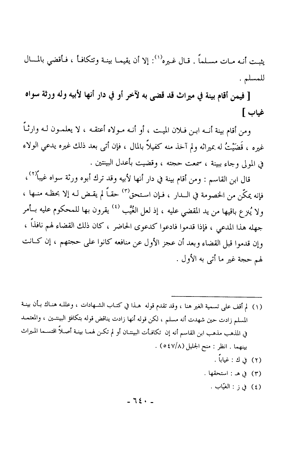 يثبت أنه مات مسلماً. قال غيره: إلا أن يقيما بينة وتتكافأ، فأقضى بالمال للمسلم.