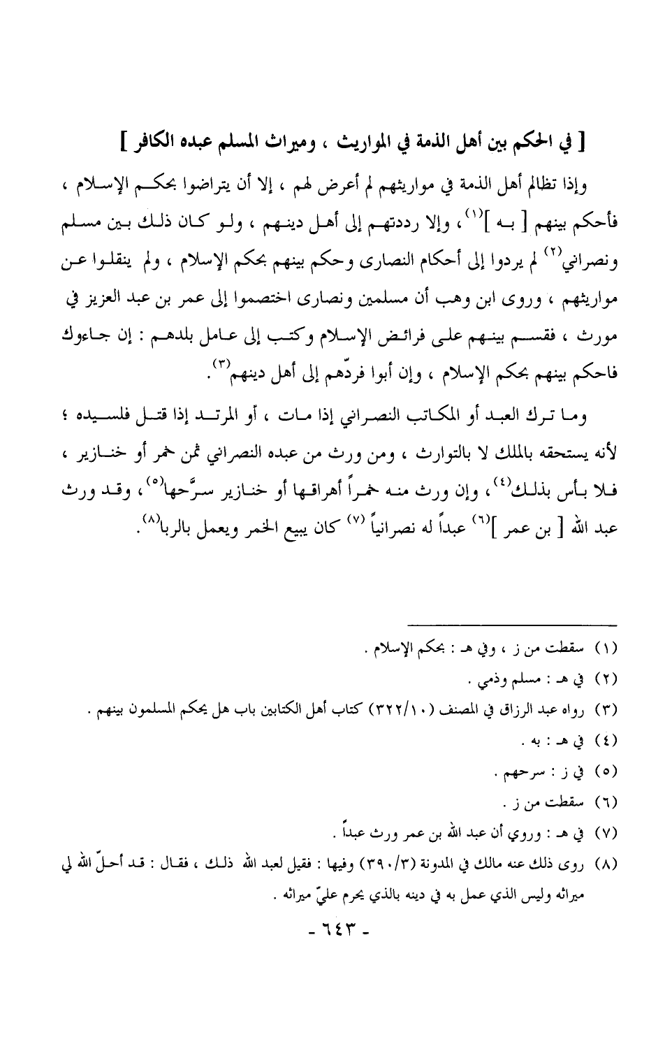 2242 - وما ترك العبد أو المكاتب النصراني إذا مات، أو المرتد إذا قتل فلسيده لأنه يستحقه بالملك لا بالتوارث، ومن ورث من عبده النصراني ثمن خمر أو خنازير فلا بأس بذلك، وإن ورث منه خمراً أهراقها أو خنازير سرّحها، وقد ورث عبد الله [بن عمر] عبداً له نصرانياً كان يبيع الخمر ويعمل بالربا.