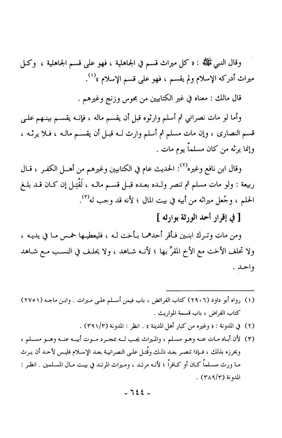وقال النبي ÷: "كل ميراث قسم في الجاهلية، فهو على قسم الجاهلية، وكل ميراث أدركه الإسلام ولم يقسم، فهو على قسم الإسلام". (¬1)
