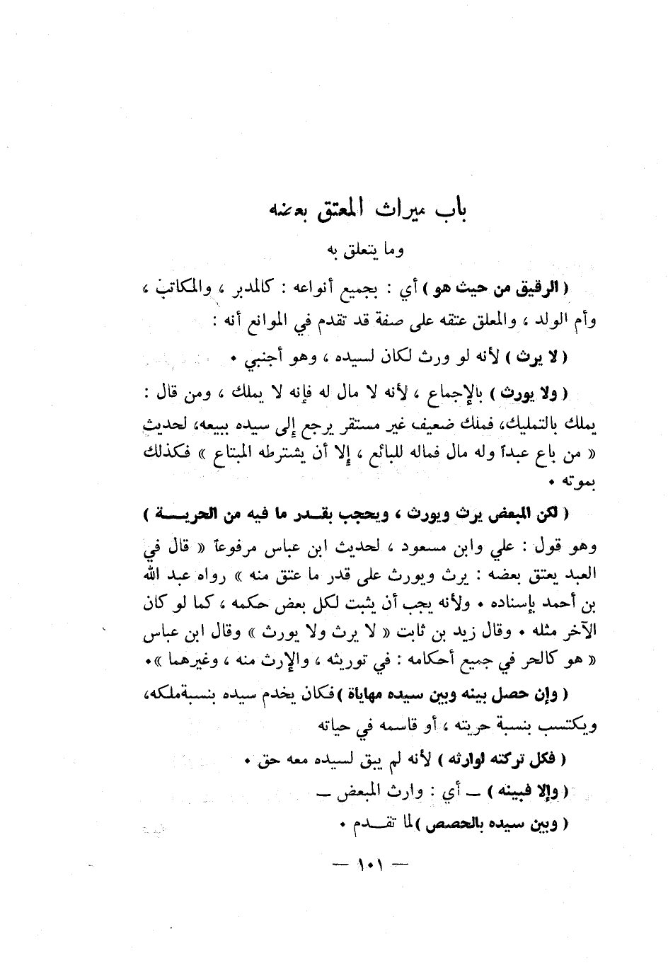 "لكن المبعض يرث ويورث، ويحجب بقدر ما فيه من الحرية" وهو قول: علي وابن مسعود، لحديث ابن عباس مرفوعاً: قال في العبد يعتق بعضه: "يرث ويورث على قدر ما عتق منه". رواه عبد الله بن أحمد بإسناده. ولأنه يجب أن يثبت لكل بعض حكمه، كما لو كان الآخر مثله. وقال زيد بن ثابت: لا يرث ولا يورث وقال ابن عباس: هو كالحر في جميع أحكامه: في توريثه، والإرث منه، وغيرهما.