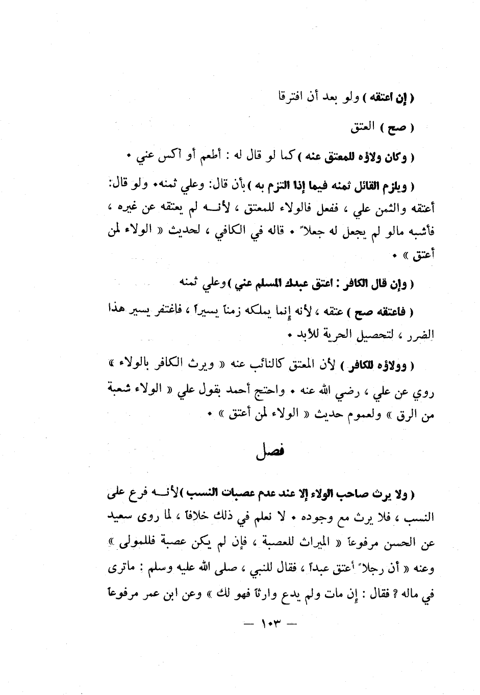 فصل ولا يرث صاحب الولاء إلا عند عدم عصبات النسب:
