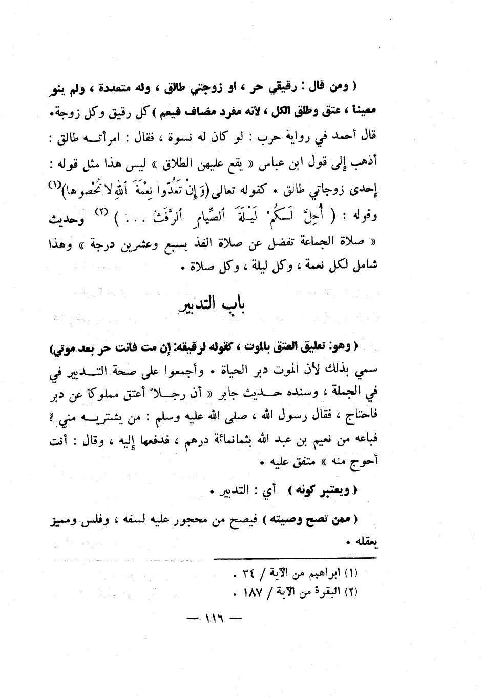 "وهو: تعليق العتق بالموت، كقوله لرقيقه: إن مت فأنت حر بعد موتي" سمي بذلك لأن الموت دبر الحياة، وأجمعوا على صحة التدبير في الجملة، وسنده حديث جابر: أن رجلاً أعتق مملوكاً عن دبر فاحتاج، فقال رسول الله، صلى الله عليه وسلم: "من يشتريه مني؟ " فباعه من نعيم بن عبد الله بثمانمائة درهم، فدفعها إليه، وقال: "أنت أحوج منه" متفق عليه.