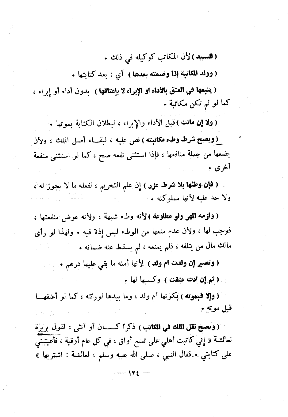 "ويصح نقل الملك في المكاتب" ذكراً كان أو أنثى، لقول بريرة لعائشة: إني كاتبت أهلي على تسع أواق، في كل عام أوقية، فأعينيني على كتابتي. فقال النبي، صلى الله عليه وسلم، لعائشة: "اشتريها"
