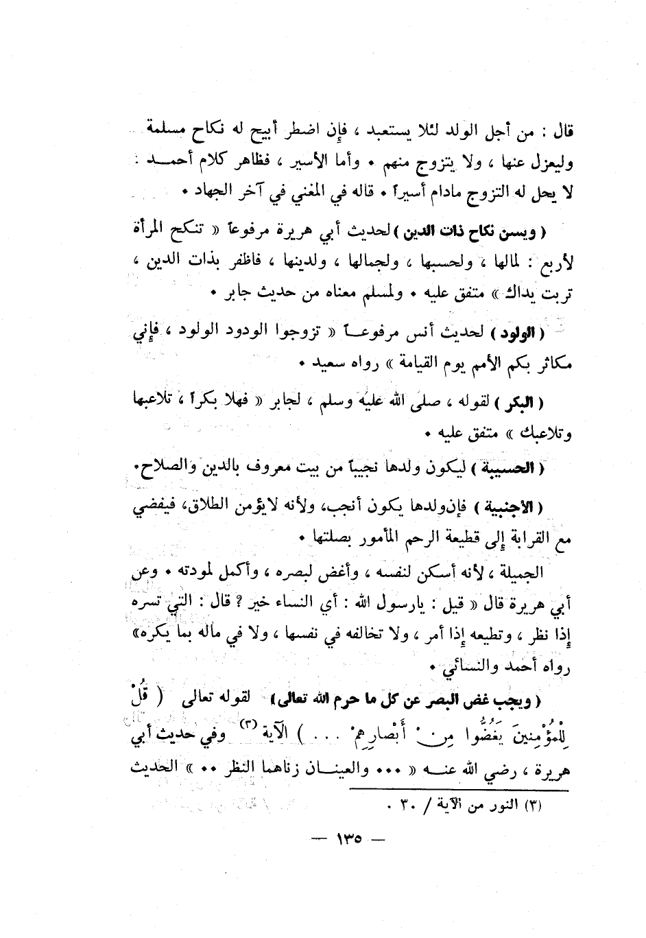 "الأجنبية" فإن ولدها يكون أنجب، ولأنه لا يؤمن الطلاق، فيفضي مع القرابة إلى قطيعة الرحم المأمور بصلتها. الجميلة، لأنه أسكن لنفسه، وأغض لبصره، وأكمل لمودته. وعن أبي هريرة قال: قيل: يا رسول الله: أي النساء خير؟ قال: "التي تسره إذا نظر، وتطيعه إذا أمر، ولا تخالفه في نفسها، ولا في ماله بما يكره" رواه أحمد والنسائي.