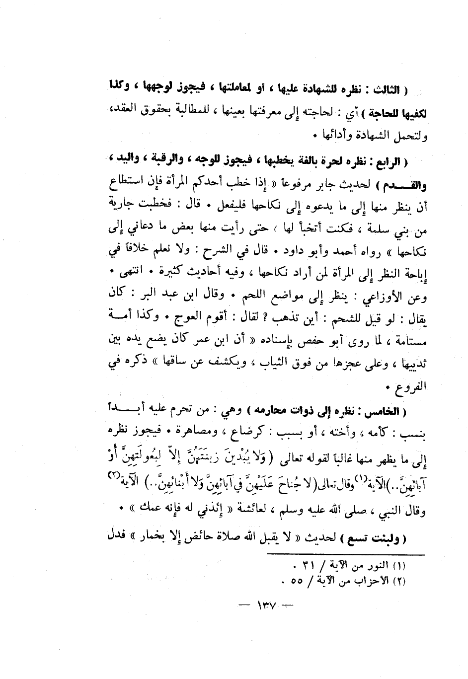 "الخامس: نظره إلى ذوات محارمه" وهي: من تحرم عليه أبداً بنسب: كأمه، وأخته، أو بسبب: كرضاع، ومصاهرة، فيجوز نظره إلى ما يظهر منها غالباً لقوله تعالى: {وَلا يُبْدِينَ زِينَتَهُنَّ إِلَّا لِبُعُولَتِهِنَّ أَوْ آبَائِهِنَّ} 1. وقال تعالى: {لا جُنَاحَ عَلَيْهِنَّ فِي آبَائِهِنَّ وَلا أَبْنَائِهِنَّ} 2. وقال النبي، صلى الله عليه وسلم، لعائشة "إئذني له فإنه عمك".