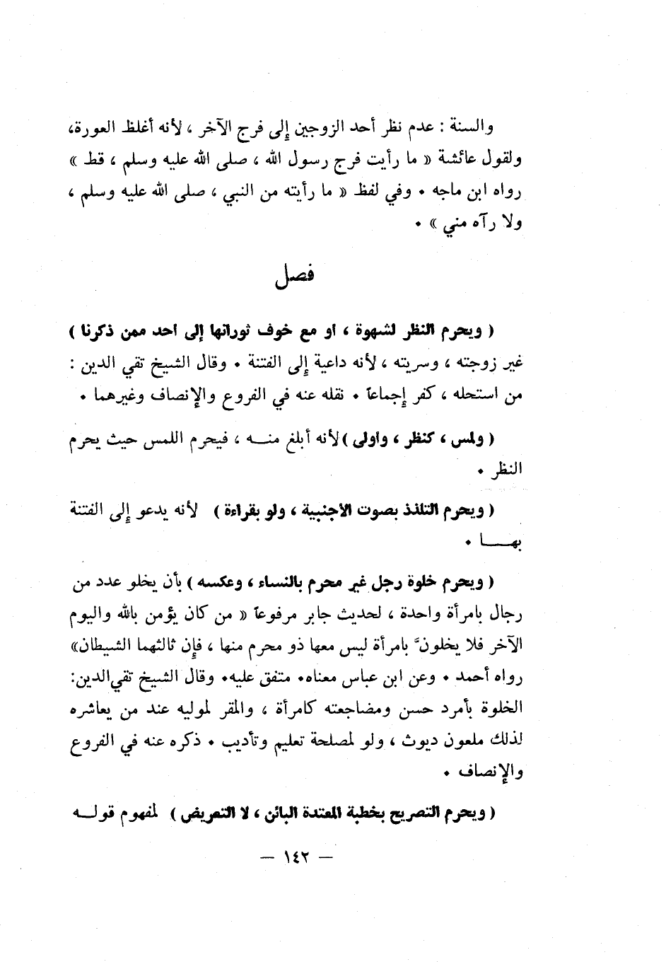 "أو مع خوف ثورانها إلى أحد ممن ذكرنا" غير زوجته، وسريته، لأنه داعية إلى الفتنة. وقال الشيخ تقي الدين: من استحله، كفر إجماعاً. نقله عنه في الفروع والإنصاف وغيرهما.
