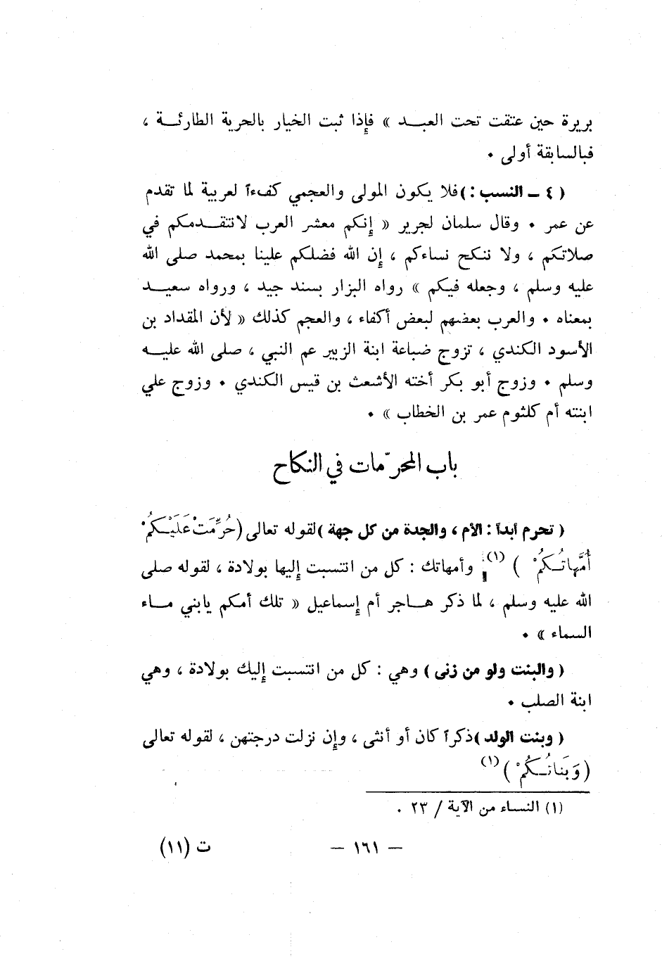 "4- والنسب:" فلا يكون المولى والعجمي كفءاً لعربية لما تقدم عن عمر. وقال سلمان لجرير: إنكم معشر العرب لا نتقدمكم في صلاتكم، ولا ننكح نساءكم، إن الله فضلكم علينا بمحمد صلى الله عليه وسلم، وجعله فيكم رواه البزار بسند جيد، ورواه سعيد بمعناه. والعرب بعضهم لبعض أكفاء، والعجم كذلك لأن المقداد بن الأسود الكندي، تزوج ضباعة ابنة الزبير عم النبي، صلى الله عليه وسلم. وزوج أبو بكر أخته الأشعث بن قيس الكندي. وزوج علي ابنته أم كلثوم عمر بن الخطاب.