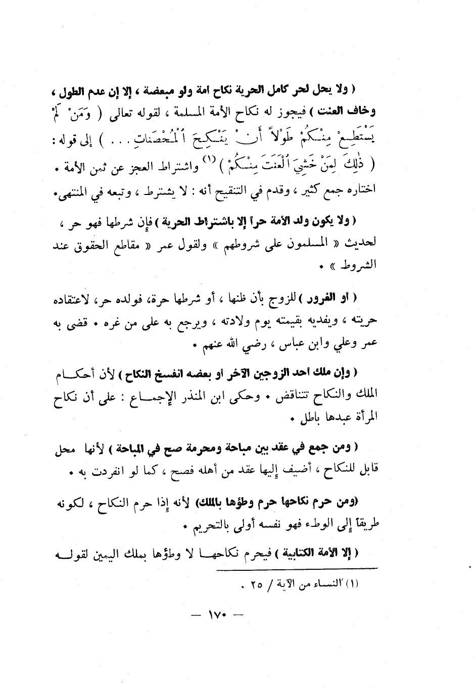 "ولا يحل لحر كامل الحرية نكاح أمة ولو مبعضة، إلا إن عدم الطول، وخاف العنت" فيجوز له نكاح الأمة المسلمة، لقوله تعالى: {وَمَنْ لَمْ يَسْتَطِعْ مِنْكُمْ طَوْلاً أَنْ يَنْكِحَ الْمُحْصَنَاتِ ... } إلى قوله: {ذَلِكَ لِمَنْ خَشِيَ الْعَنَتَ مِنْكُمْ} 1 واشتراط العجز عن ثمن الأمة. اختاره جمع كثير، وقدم في التنقيح أنه: لا يشترط، وتبعه في المنتهى.