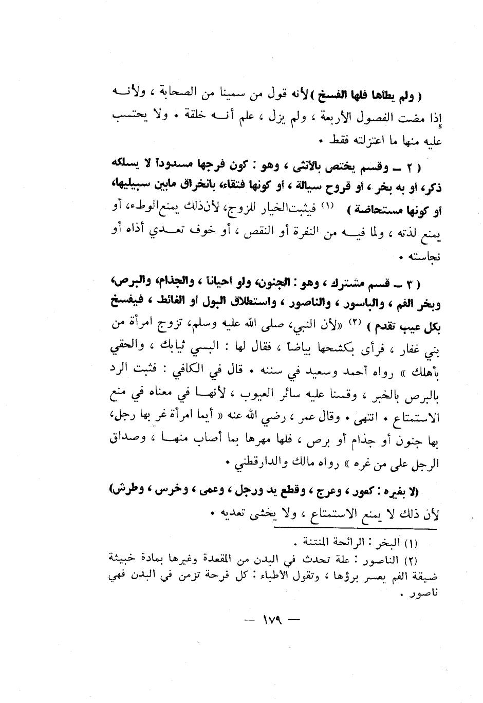 "وقسم مشترك، وهو: الجنون، ولو أحياناً، والجذام، البرص، وبخر الفم، والباسور، والناصور، واستطلاق البول أو الغائط، فيفسخ بكل عيب تقدم" 2 لأن النبي، صلى الله عليه وسلم، تزوج امرأة من بني غفار، فرأى بكشحها بياضاً، فقال لها: "البسي ثيابك، والحقي بأهلك" رواه أحمد وسعيد في سننه. قال في الكافي: فثبت الرد بالبرص بالخبر، وقسنا عليه سائر العيوب، لأنها في معناه في منع الاستمتاع. انتهى. وقال عمر، رضي الله عنه: "أيما امرأة غر بها رجل، بها جنون أو جذام أو برص، فلها مهرها بما أصاب منها، وصداق الرجل على من غره" رواه مالك والدارقطني.