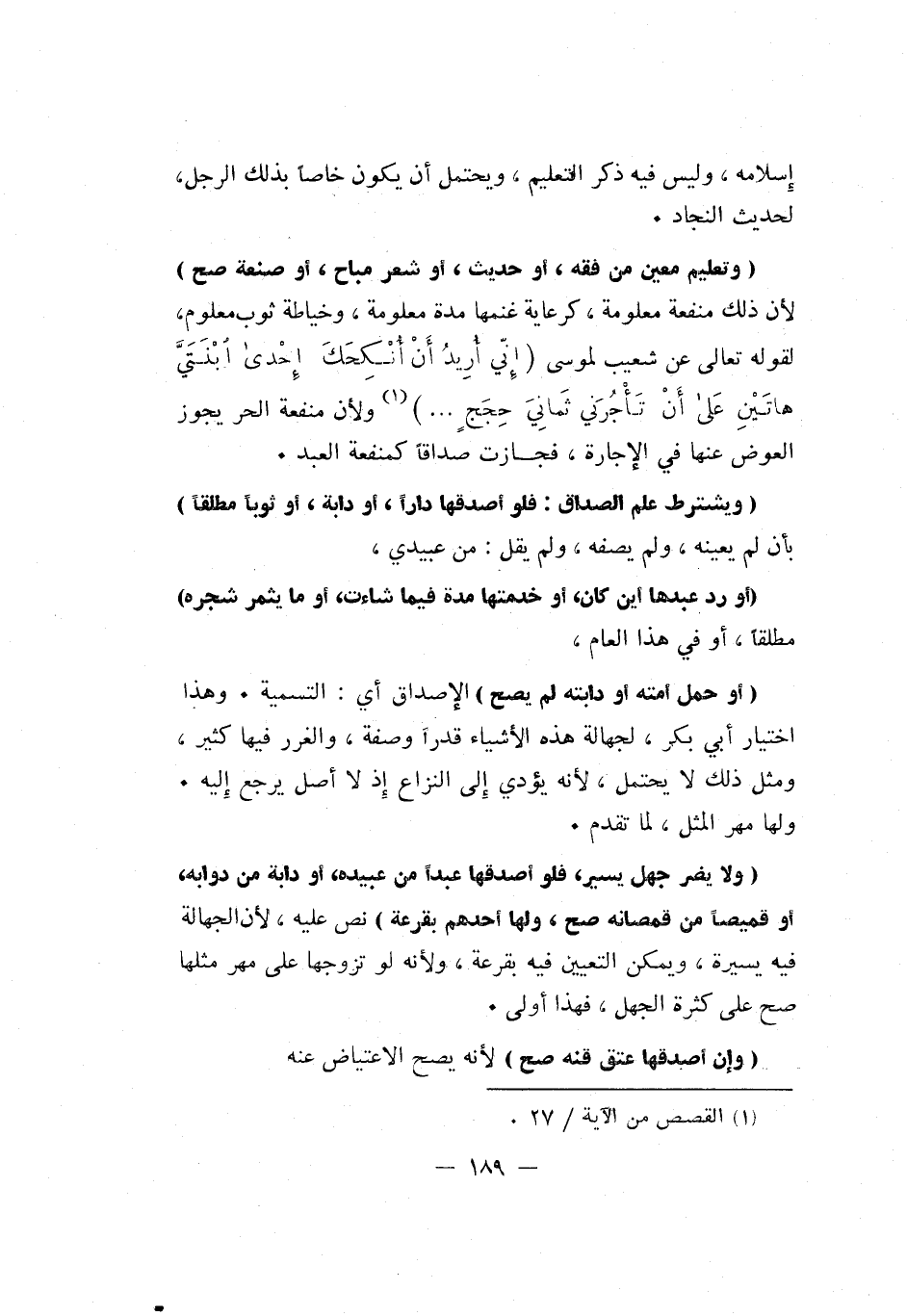 "وتعليم معين من فقه، أو حديث، أو شعر مباح، أو صنعة صح" لأن ذلك منفعة معلومة، كرعاية غنمها مدة معلومة، وخياطة ثوب معلوم، لقوله تعالى عن شعيب لموسى: {قَالَ إِنِّي أُرِيدُ أَنْ أُنْكِحَكَ إِحْدَى ابْنَتَيَّ هَاتَيْنِ عَلَى أَنْ تَأْجُرَنِي ثَمَانِيَ حِجَجٍ ... } 1 ولأن منفعة الحر يجوز العوض عنها في الإجارة، فجازت صداقاً كمنفعة العبد.