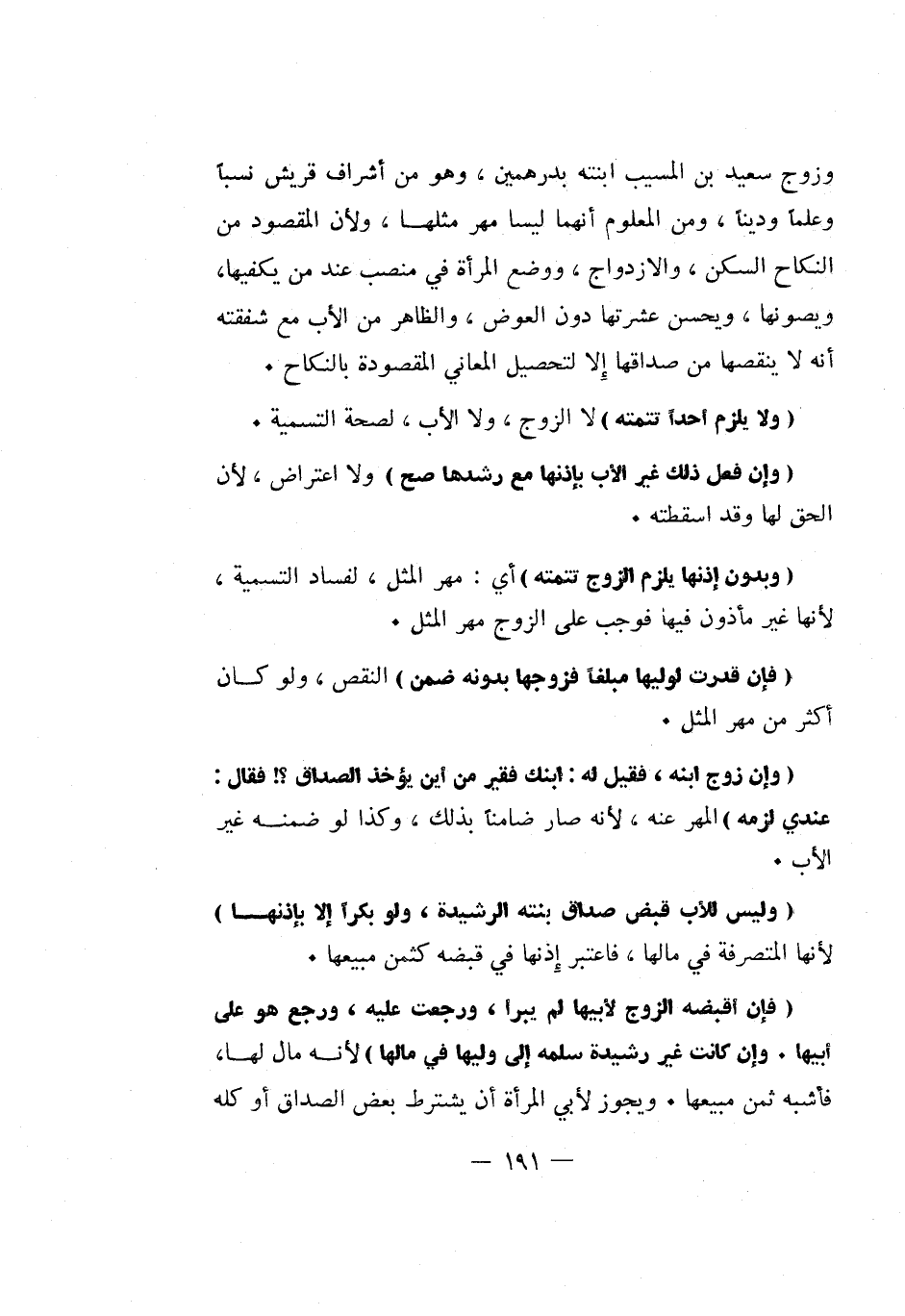 وزوج سعيد بن المسيب ابنته بدرهمين، وهو من أشراف قريش نسباً وعلماً وديناً، ومن المعلوم أنهما ليسا مهر مثلها، ولأن المقصود من النكاح السكن، والازدواج، ووضع المرأة في منصب عند من يكفيها، ويصونها، ويحسن عشرتها دون العوض، والظاهر من الأب مع شفقته أنه لا ينقصها من صداقها إلا لتحصيل المعاني المقصودة بالنكاح.