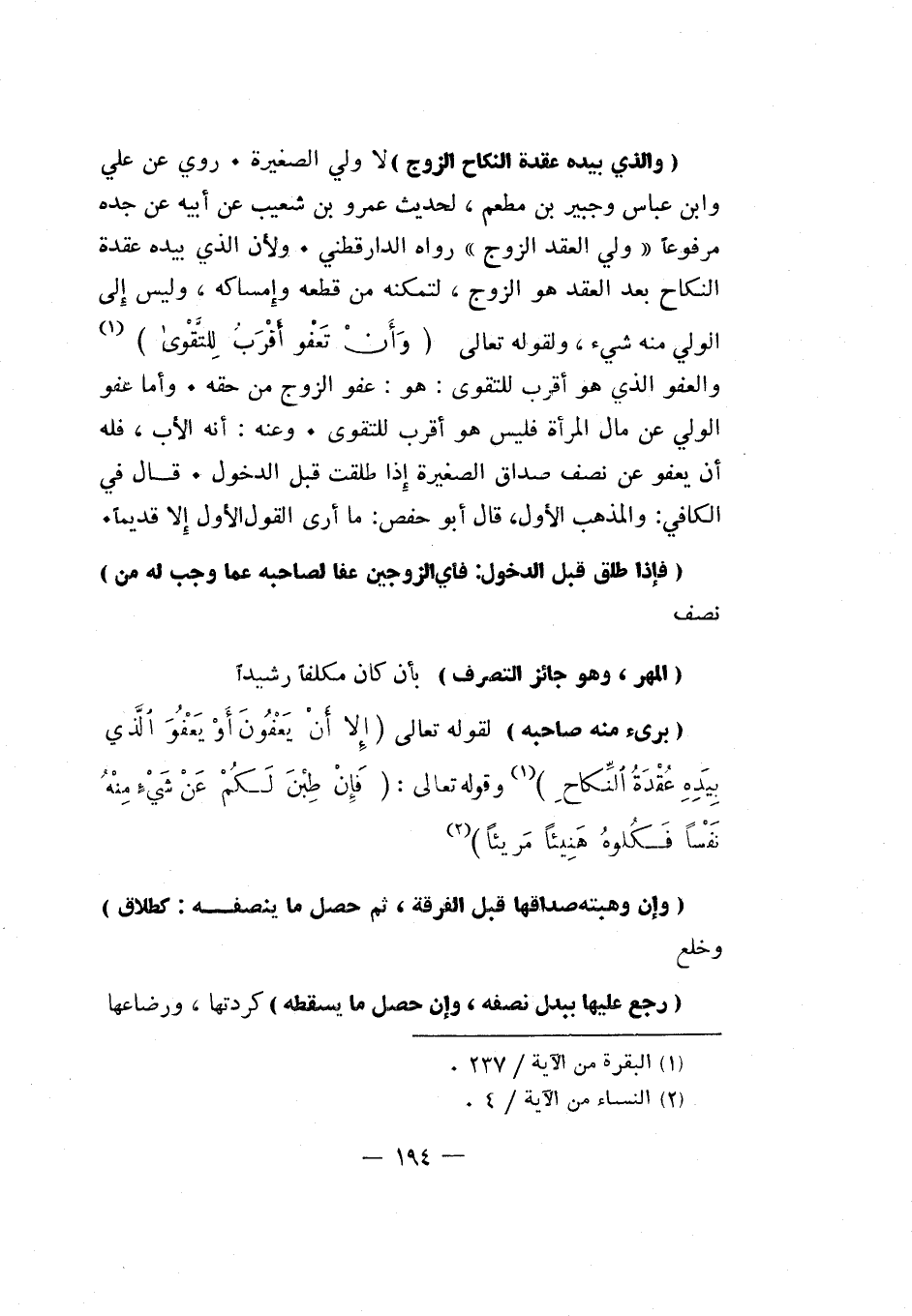 "والذي بيده عقدة النكاح الزوج" لا ولي الصغيرة. روي عن علي وابن عباس وجبير بن مطعم، لحديث عمرو بن شعيب عن أبيه عن جده مرفوعاً: "ولي العقد الزوج". رواه الدارقطني. ولأن الذي بيده عقدة النكاح بعد العقد هو الزوج، لتمكنه من قطعه وإمساكه، وليس إلى الولي منه شيء، ولقوله تعالى: {وَأَنْ تَعْفُوا أَقْرَبُ لِلتَّقْوَى} 1 والعفو الذي هو أقرب للتقوى: هو: عفو الزوج من حقه. وأما عفو الولي عن مال المرأة فليس هو أقرب للتقوى. وعنه: أنه الأب، فله أن يعفو عن نصف صداق الصغيرة إذا طلقت قبل الدخول. قال في الكافي: والمذهب الأول، قال أبو حفص: ما أرى القول الأول إلا قديماً.
