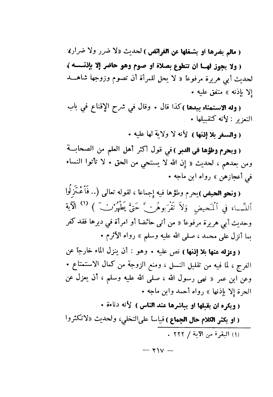"ونحو الحيض" يحرم وطؤها فيه إجماعاً، لقوله تعالى: { ... فَاعْتَزِلُوا النِّسَاءَ فِي الْمَحِيضِ وَلا تَقْرَبُوهُنَّ حَتَّى يَطْهُرْنَ} 1. وحديث أبي هريرة مرفوعاً: "من أتى حائضاً أو امرأةً في دبرها فقد كفر بما أنزل على محمد، صلى الله عليه وسلم" رواه الأثرم.