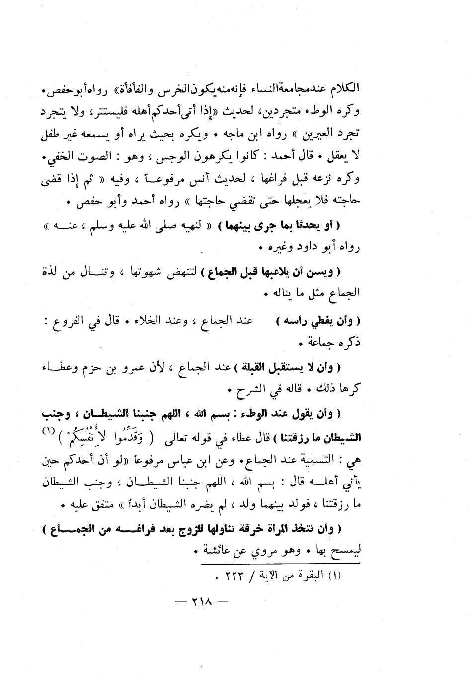 الكلام عند مجامعة النساء فإنه منه يكون الخرس والفأفأة" رواه أبو حفص. وكره الوطء متجردين، لحديث: "إذا أتى أحدكم أهله فليستتر، ولا يتجرد تجرد العيرين" رواه ابن ماجه. ويكره بحيث يراه أو يسمعه غير طفل لا يعقل. قال أحمد: كانوا يكرهون الوجس، وهو: الصوت الخفي. وكره نزعه قبل فراغها، لحديث أنس مرفوعاً، وفيه: "ثم إذا قضى حاجته فلا يعجلها حتى تقضي حاجتها" رواه أحمد وأبو حفص.