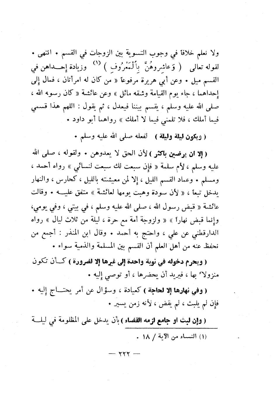 "إلا أن يرضين بأكثر" لأن الحق لا يعدوهن، ولقوله، صلى الله عليه وسلم، لأم سلمة: "فإن سبعت لك سبعت لنسائي". رواه أحمد، ومسلم. وعماد القسم الليل، إلا لمن معيشته بالليل، كحارس، والنهار يدخل تبعاً، لأن سودة وهبت يومها لعائشة متفق عليه. وقالت عائشة قبض رسول الله، صلى الله عليه وسلم، في بيتي، وفي يومي، وإنما قبض نهاراً. ولزوجة أمة مع حرة، ليلة من ثلاث ليال رواه الدارقطني عن علي، واحتج به أحمد. وقال ابن المنذر: أجمع من نحفظ عنه من أهل العلم أن القسم بين المسلمة والذمية سواء.