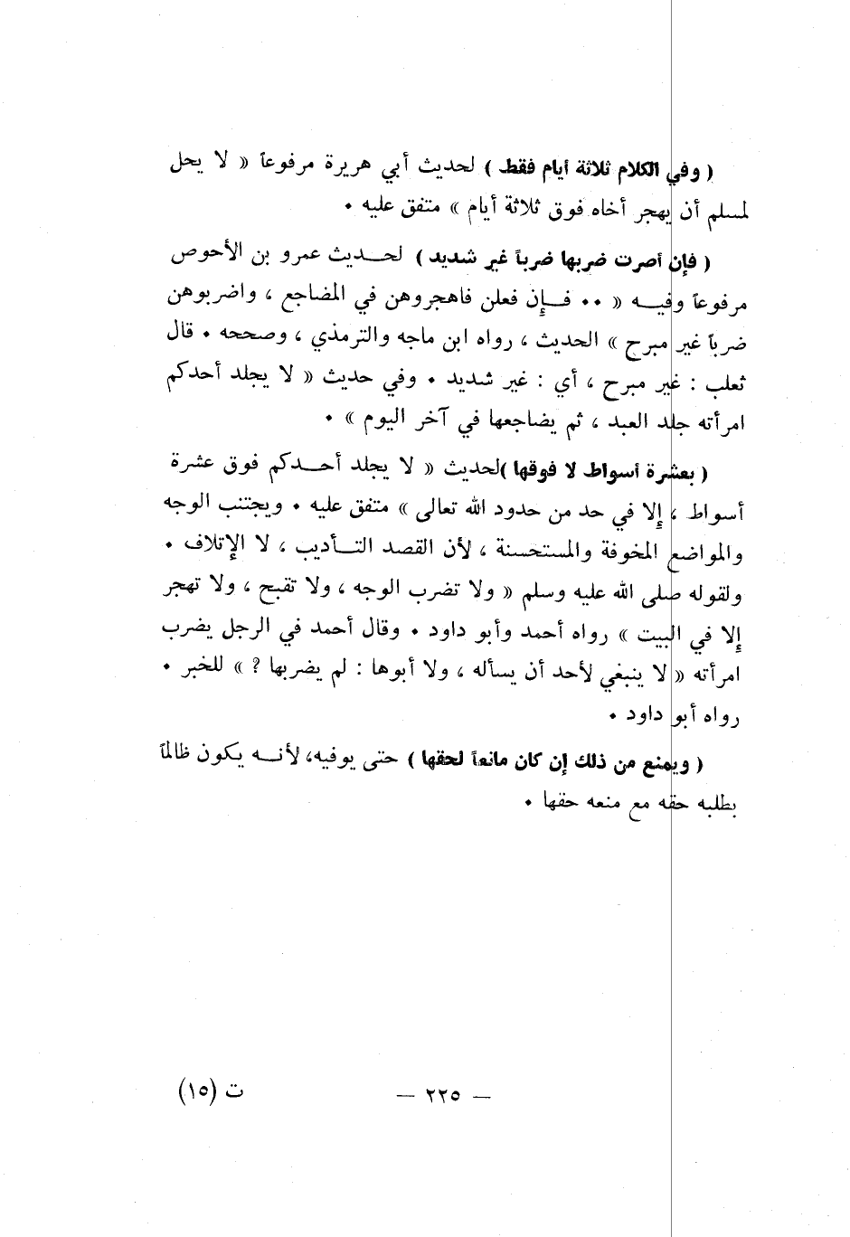 "فإن أصرت ضربها ضرباً غير شديد" لحديث عمرو بن الأحوص مرفوعاً وفيه: " ... فإن فعلن فاهجروهن في المضاجع، واضربوهن ضرباً غير مبرح" الحديث، رواه ابن ماجه والترمذي. وصححه. قال ثعلب: غير مبرح، أي: غير شديد. وفي حديث: "لا يجلد أحدكم امرأته جلد العبد، ثم يضاجعها في آخر اليوم".