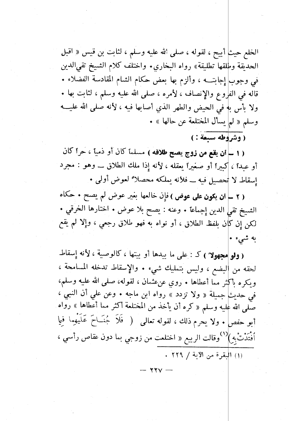 "2- أن يكون على عوض" فإن خالعها بغير عوض لم يصح. حكاه الشيخ تقي الدين إجماعا. وعنه: يصح بلا عوض. اختارها الخرقي. لكن إن كان بلفظ الطلاق، أو نواه به فهو طلاق رجعي، وإلا لم يقع به شيء.