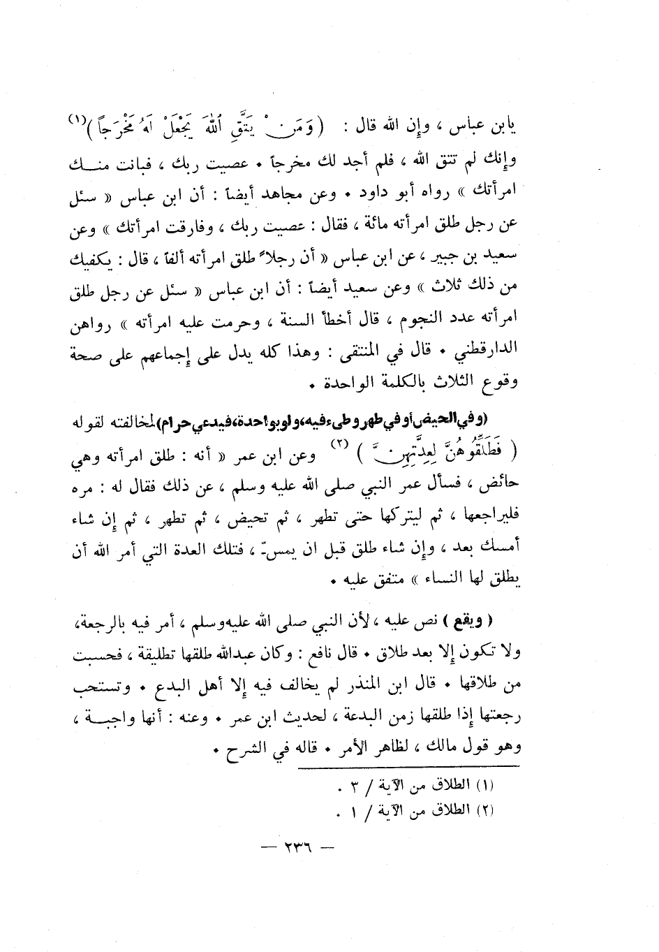 يا بن عباس، وإن الله قال: {وَمَنْ يَتَّقِ اللَّهَ يَجْعَلْ لَهُ مَخْرَجا} 1 وإنك لم تتق الله، فلم أجد لك مخرجا. عصيت ربك، فبانت منك امرأتك رواه أبو داود. وعن مجاهد أيضا: أن ابن عباس سئل عن رجل طلق امرأته مائة، فقال: عصيت ربك، وفارقت امرأتك وعن سعيد بن جبير، عن ابن عباس أن رجلا طلق امرأته ألفا، قال: يكفيك من ذلك ثلاث وعن سعيد أيضا: أن ابن عباس سئل عن رجل طلق امرأته عدد النجوم، قال أخطأ السنة، وحرمت عليه امرأته رواهن الدارقطني. قال في المنتقى: وهذا كله يدل على إجماعهم على صحة وقوع الثلاث بالكلمة الواحدة.