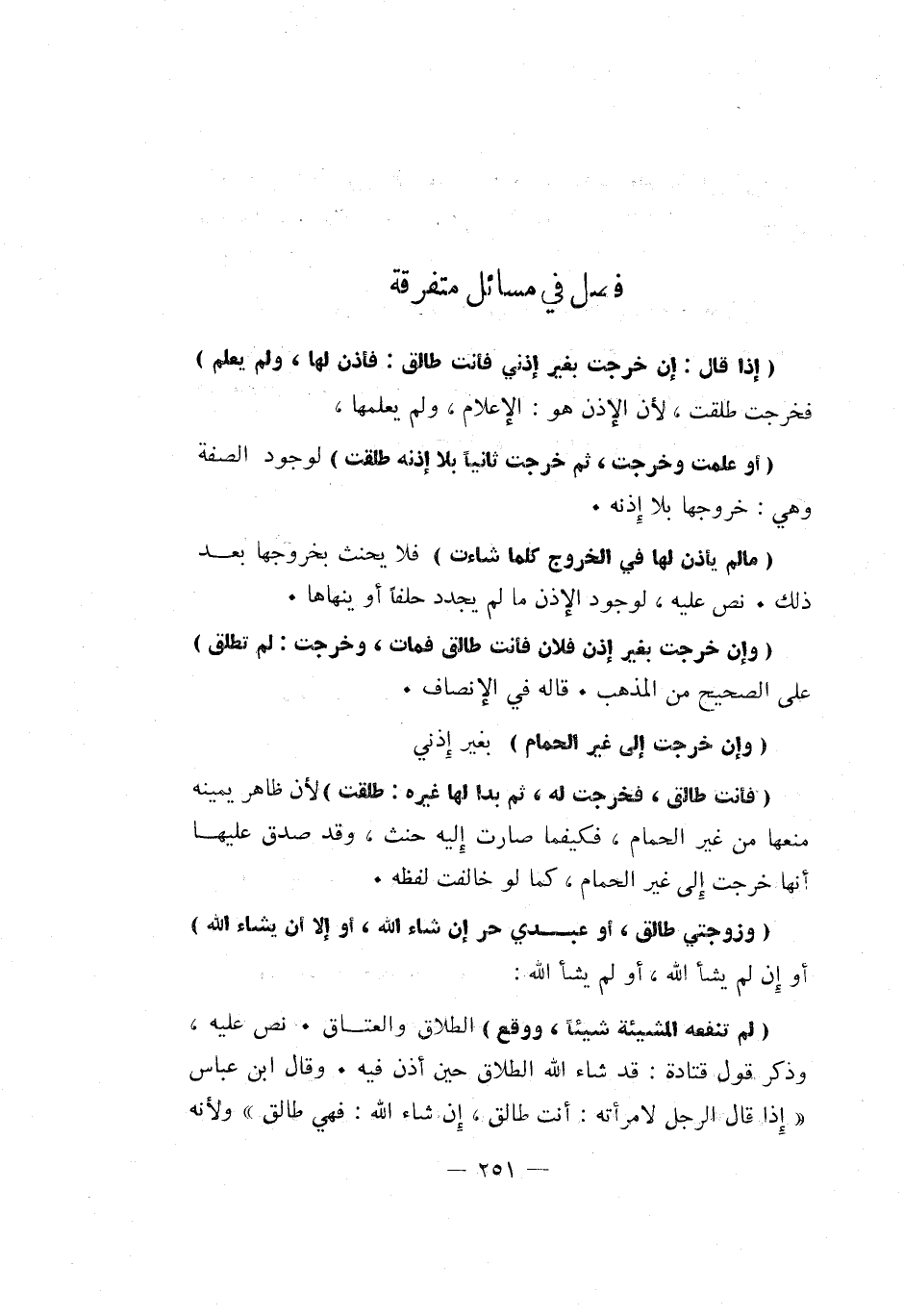 "ما لم يأذن لها في الخروج كلما شاءت" فلا يحنث بخروجها بعد ذلك. نص عليه، لوجود الإذن ما لم يجدد حلفا أو ينهاها.