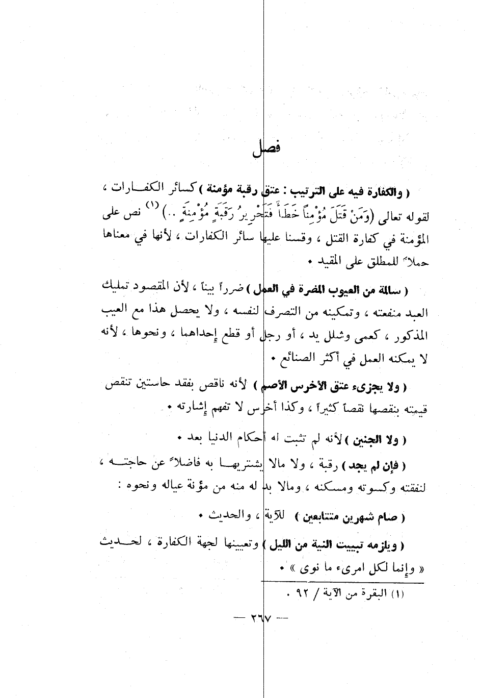 "عتق رقبة مؤمنة" كسائر الكفارات، لقوله تعالى: {وَمَنْ قَتَلَ مُؤْمِناً خَطَأً فَتَحْرِيرُ رَقَبَةٍ مُؤْمِنَةٍ ... } 1 نص على المؤمنة في كفارة القتل. وقسنا عليها سائر الكفارات، لأنها في معناها حملا للمطلق على المقيد.