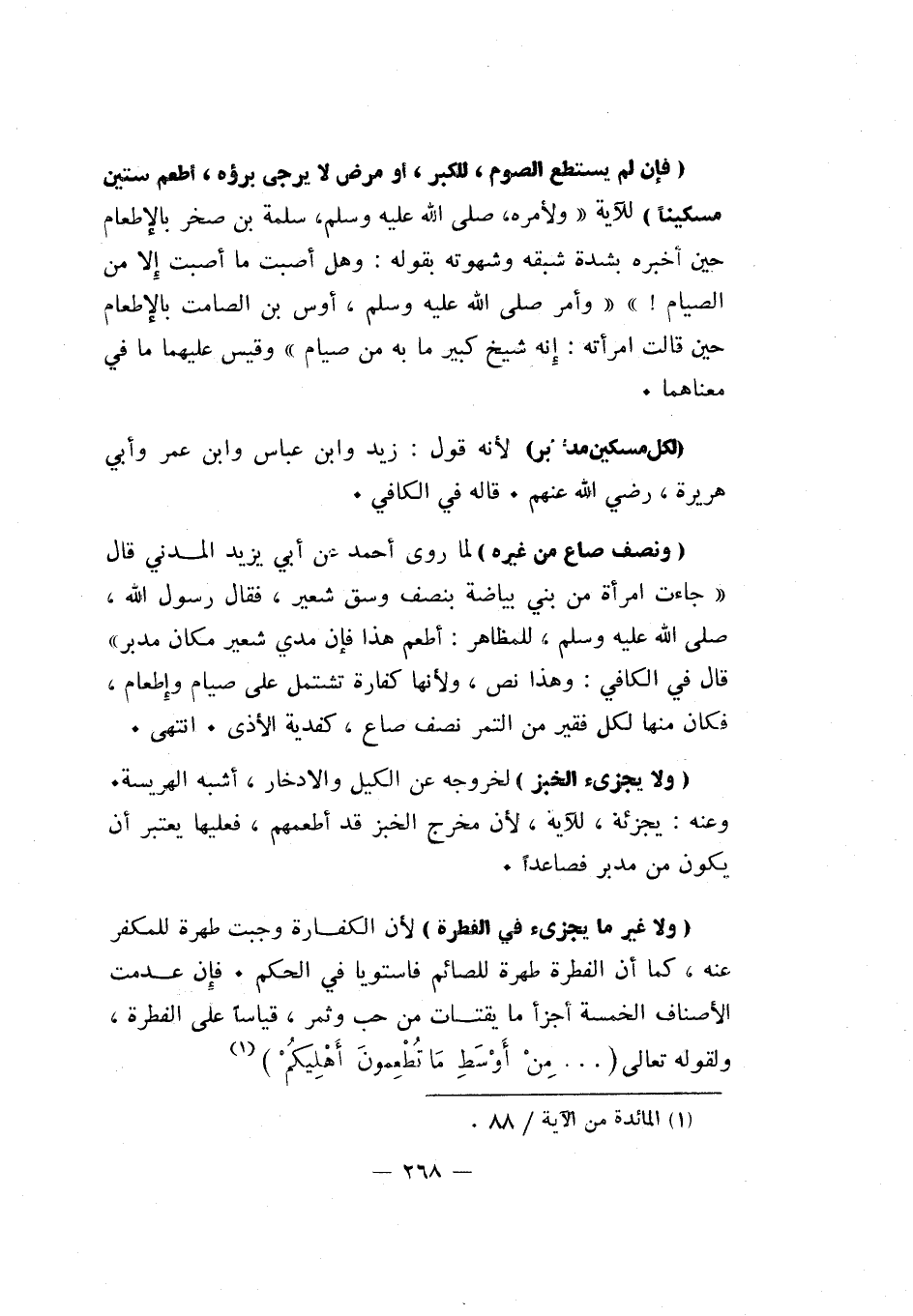 "فإن لم يستطع الصوم، للكبر، أو مرض لا يرجى برؤه، أطعم ستين مسكينا" للآية ولأمره، صلى الله عليه وسلم، سلمة بن صخر بالإطعام حين أخبره بشدة شبقه وشهوته بقوله: وهل أصبت ما أصبت إلا من الصيام!. وأمر صلى الله عليه وسلم، أوس بن الصامت بالإطعام حين قالت امرأته: إنه شيخ كبير ما به من صيام وقيس عليهما ما في معناهما.