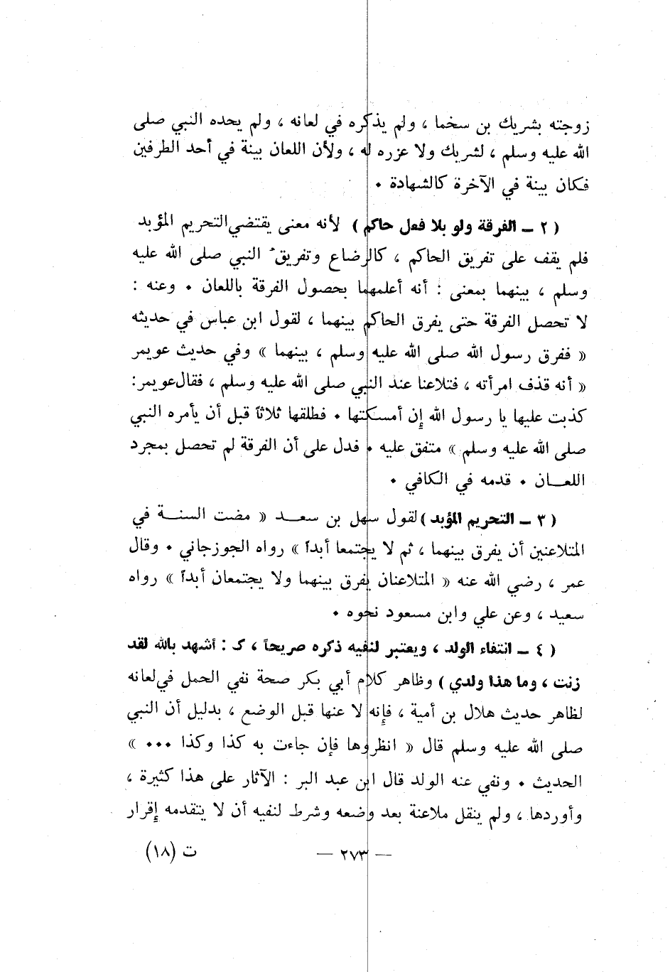 "2- الفرقة ولو بلا فعل حاكم" لأنه معنى يقتضي التحريم المؤبد فلم يقف على تفريق الحاكم، كالرضاع وتفريق النبي صلى الله عليه وسلم، بينهما بمعنى: أنه أعلمهما بحصول الفرقة باللعان. وعنه لا تحصل الفرقة حتى يفرق الحاكم بينهما، لقول ابن عباس في حديثه: ففرق رسول الله صلى الله عليه وسلم، بينهما. وفي حديث عويمر: أنه قذف امرأته، فتلاعنا عند النبي صلى الله عليه وسلم، فقال عويمر: كذبت عليها يا رسول الله إن أمسكتها. فطلقها ثلاثا قبل أن يأمره النبي صلى الله عليه وسلم متفق عليه. فدل على أن الفرقة لم تحصل بمجرد اللعان. قدمه في الكافي.