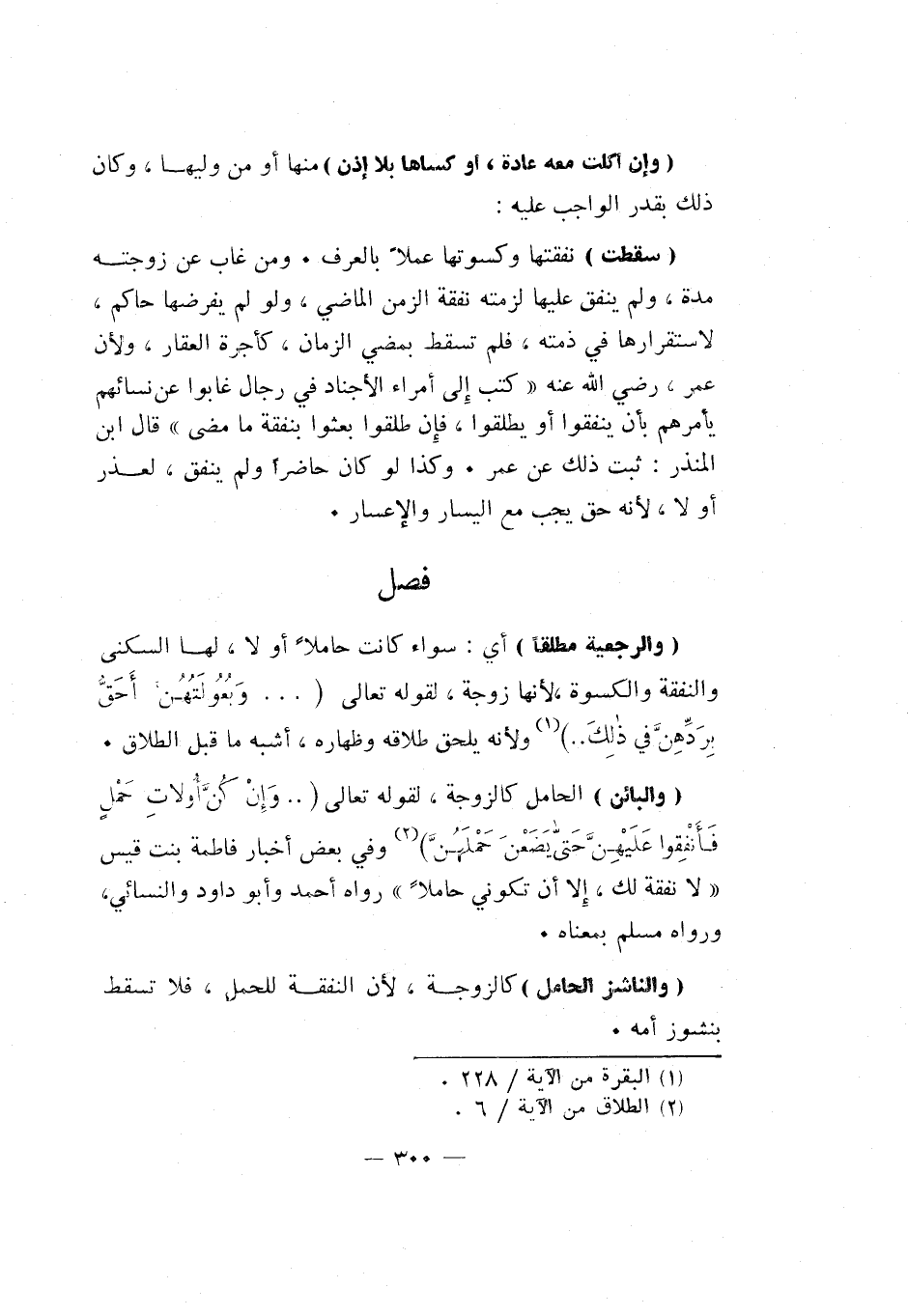 "والبائن" الحامل كالزوجة، لقوله تعالى: { ... وَإِنْ كُنَّ أُولاتِ حَمْلٍ فَأَنْفِقُوا عَلَيْهِنَّ حَتَّى يَضَعْنَ حَمْلَهُنَّ} 2 وفي بعض أخبار فاطمة بنت قيس: "لا نفقة لك، إلا أن تكوني حاملا" رواه أحمد وأبو داود والنسائي، ورواه مسلم بمعناه.