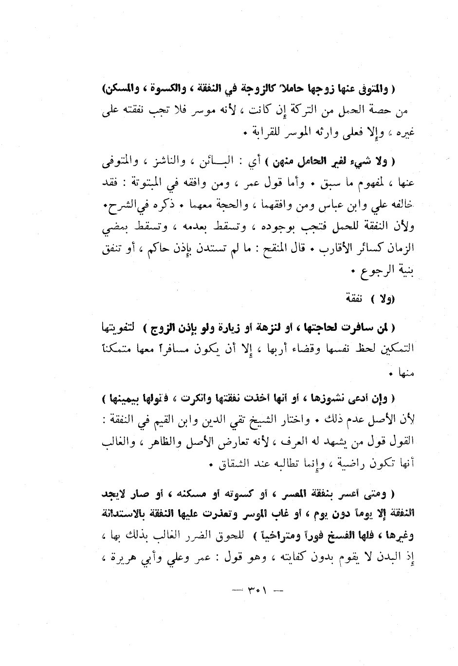 "ولا شيء لغير الحامل منهن" أي: البائن، والناشز، والمتوفى عنها، لمفهوم ما سبق. وأما قول عمر، ومن وافقه في المبتوتة: فقد خالفه علي وابن عباس ومن وافقهما، والحجة معهما. ذكره في الشرح. ولأن النفقة للحمل فتجب بوجوده، وتسقط بعدمه، وتسقط بمضي الزمان كسائر الأقارب. قال المنقح: ما لم تستدن بإذن حاكم، أو تنفق بنية الرجوع.