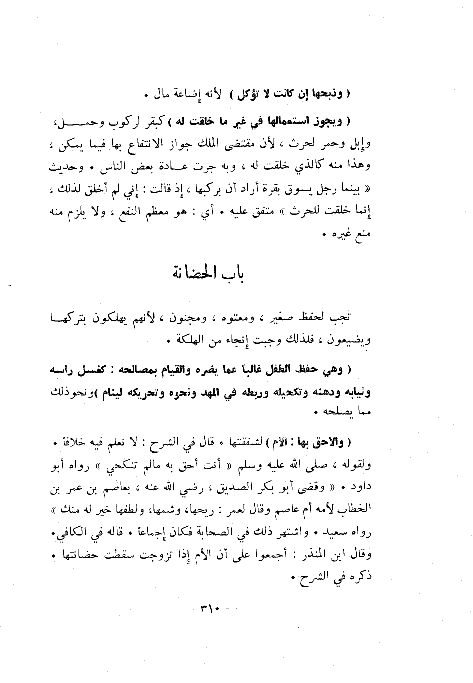 "وهي حفظ الطفل غالبا عما يضره والقيام بمصالحه: كغسل رأسه وثيابه ودهنه وتكحيله وربطه في المهد ونحوه وتحريكه لينام" ونحو ذلك مما يصلحه.