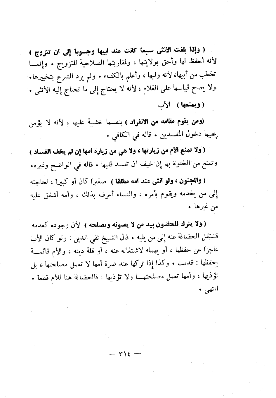 "وإذا بلغت الأنثى سبعا كانت عند أبيها وجوبا إلى أن تتزوج" لأنه أحفظ لها وأحق بولايتها، ولمقاربتها الصلاحية للتزويج. وإنما تخطب من أبيها، لأنه وليها، وأعلم بالكفء. ولم يرد الشرع بتخييرها. ولا يصح قياسها على الغلام، لأنه لا يحتاج إلى ما تحتاج إليه الأنثى.