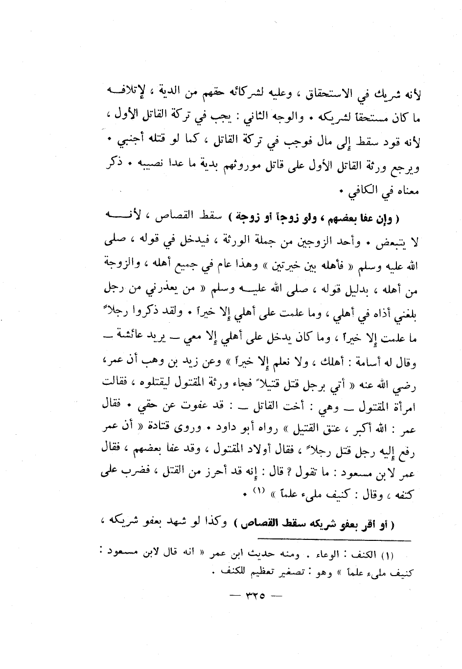 "وإن عفا بعضهم، ولو زوجا أو زوجة" سقط القصاص، لأنه لا يتبعض. وأحد الزوجين من جملة الورثة، فيدخل في قوله، صلى الله عليه وسلم "فأهله بين خيرتين" وهذا عام في جميع أهله، والزوجة من أهله، بدليل قوله، صلى الله عليه وسلم "من يعذرني من رجل بلغني أذاه في أهلي، وما علمت على أهلي إلا خيرا. ولقد ذكروا رجلا ما علمت عليه إلا خيرا، وما كان يدخل على أهلي إلا معي" - يريد عائشة - وقال له أسامة: أهلك، ولا نعلم إلا خيرا وعن زيد بن وهب أن عمر، رضي الله عنه أتي برجل قتل قتيلا فجاء ورثة المقتول ليقتلوه، فقالت امرأة المقتول - وهي: أخت القاتل -: قد عفوت عن حقي. فقال عمر: الله أكبر، عتق القتيل رواه أبو داود. وروى قتادة أن عمر رفع إليه رجل قتل رجلا، فقال أولاد المقتول، وقد عفا بعضهم، فقال عمر لابن مسعود: ما تقول؟ قال: إنه قد أحرز من القتل، فضرب على كتفه، وقال: كنيف ملئ علما1.