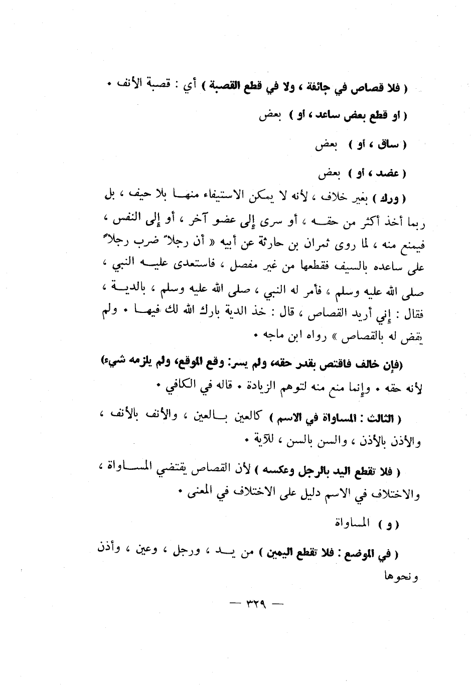 "ورك" بغير خلاف، لأنه لا يمكن الاستيفاء منها بلا حيف، بل ربما أخذ أكثر من حقه، أو سرى إلى عضو آخر، أو إلى النفس، فيمنع منه، لما روى ثمران بن حارثة عن أبيه أن رجلا ضرب رجلا على ساعده بالسيف فقطعها من غير مفصل، فاستعدى عليه النبي، صلى الله عليه وسلم، فأمر له النبي، صلى الله عليه وسلم، بالدية، فقال: إني أريد القصاص، قال: "خذ الدية بارك الله لك فيها". ولم يقض له بالقصاص رواه ابن ماجه.