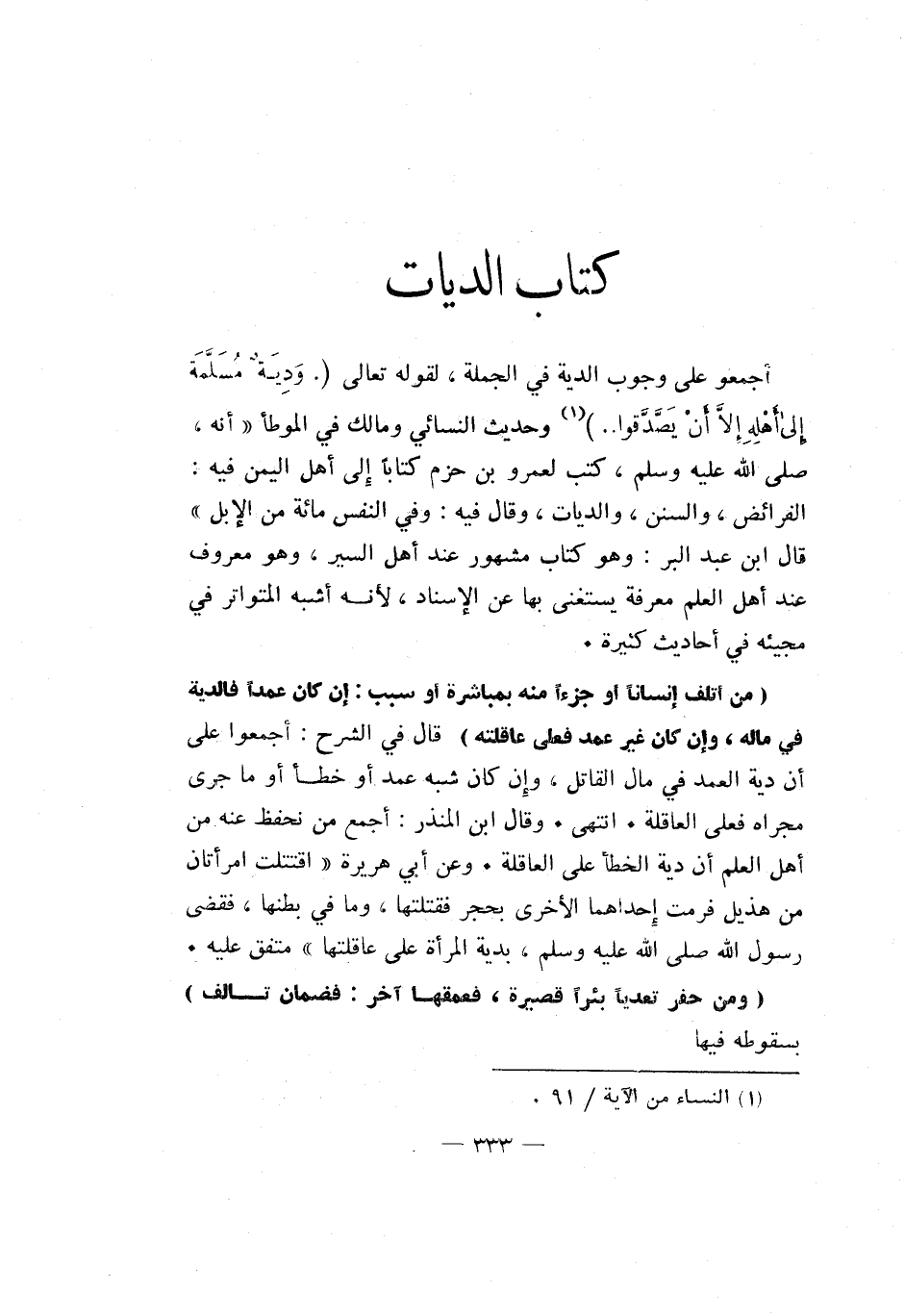 أجمعوا على وجوب الدية في الجملة، لقوله تعالى: { ... وَدِيَةٌ مُسَلَّمَةٌ إِلَى أَهْلِهِ إِلَّا أَنْ يَصَّدَّقُوا ... } 1 وحديث النسائي ومالك في الموطأ أنه، صلى الله عليه وسلم، كتب لعمرو بن حزم كتابا إلى أهل اليمن فيه: الفرائض، والسنن، والديات، وقال فيه: "وفي النفس مائة من الإبل" قال ابن عبد البر: وهو كتاب مشهور عند أهل السير، وهو معروف عند أهل العلم معرفة يستغنى بها عن الإسناد، لأنه أشبه المتواتر في مجيئه في أحاديث كثيرة.