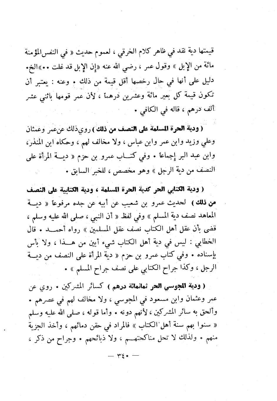 "ودية الكتابي الحر كدية الحرة المسلمة، ودية الكتابية على النصف من ذلك" لحديث عمرو بن شعيب عن أبيه عن جده مرفوعا: "دية المعاهد نصف دية المسلم" وفي لفظ أن النبي، صلى الله عليه وسلم، قضى بأن عقل أهل الكتاب نصف عقل المسلمين رواه أحمد. قال الخطابي: ليس في دية أهل الكتاب شيء أبين من هذا، ولا بأس بإسناده. وفي كتاب عمرو بن حزم: "دية المرأة على النصف من دية الرجل، وكذا جراح الكتابي على نصف جراح المسلم".