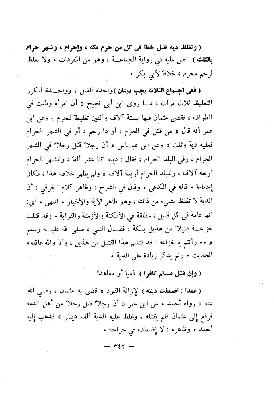 "وتغلظ دية قتل خطأ في كل من حرم مكة، وإحرام، وشهر حرام بالثلث" نص عليه في رواية الجماعة، وهو من المفردات. ولا تغلظ لرحم محرم، خلافا لأبي بكر.