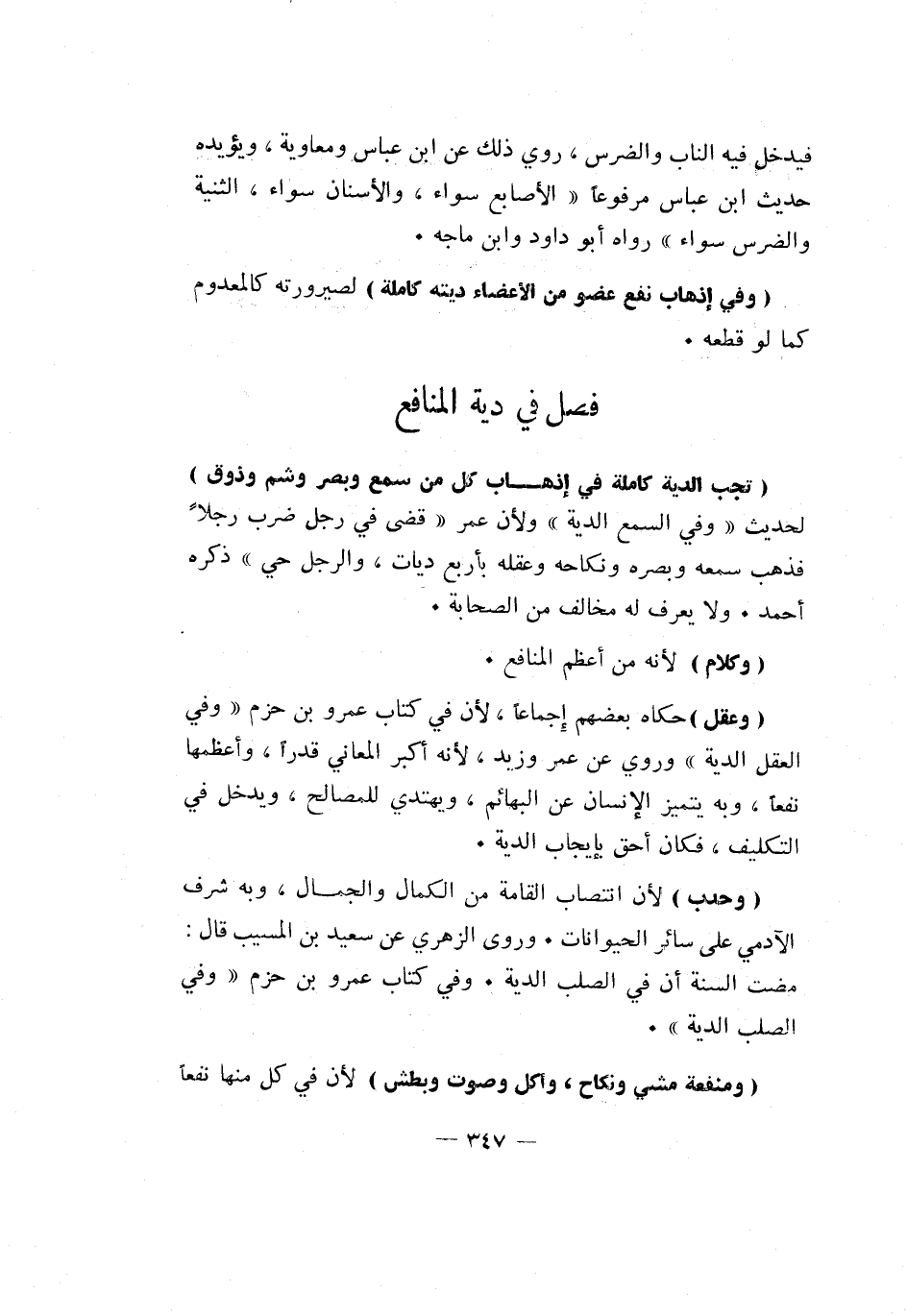 "وعقل" حكاه بعضهم إجماعا، لأن في كتاب عمرو بن حزم وفي العقل الدية وروي عن عمر وزيد، لأنه أكبر المعاني قدرا، وأعظمها نفعا، وبه يتميز الإنسان عن البهائم، ويهتدي للمصالح، ويدخل في التكليف، فكان أحق بإيجاب الدية.