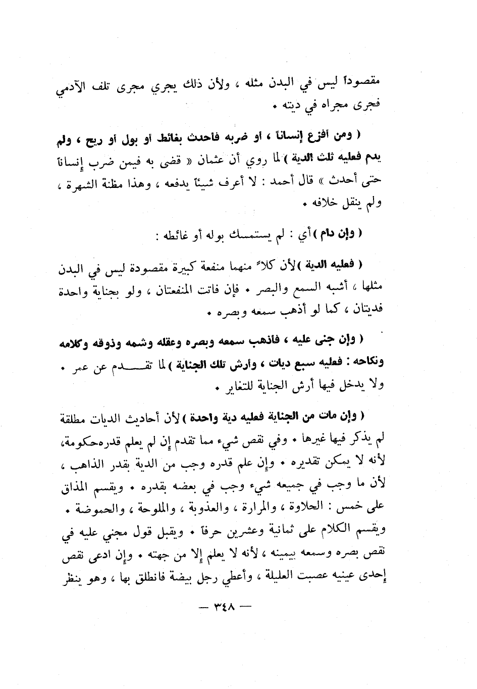 "وإن مات من الجناية فعليه دية واحدة" لأن أحاديث الديات مطلقة لم يذكر فيها غيرها. وفي نقص شيء مما تقدم إن لم يعلم قدره حكومة لأنه لا يمكن تقديره. وإن علم قدره وجب من الدية بقدر الذاهب، لأن ما وجب في جميعه شيء وجب بعضه بقدره. ويقسم المذاق على خمس: الحلاوة، والمرارة، والعذوبة، والملوحة، والحموضة. ويقسم الكلام على ثمانية وعشرين حرفا. ويقبل قول مجني عليه في نقص بصره وسمعه بيمينه، لأنه لا يعلم إلا من جهته. وإن ادعى نقص إحدى عينيه عصبت العليلة، وأعطي رجل بيضة فانطلق بها، وهو ينظر