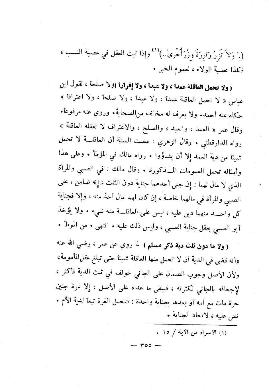 "ولا تحمل العاقلة عمدا، ولا عبدا، ولا إقرارا" ولا صلحا، لقول ابن عباس: "لا تحمل العاقلة عمدا، ولا عبدا، ولا صلحا، ولا اعترافا" حكاه عنه أحمد، ولا يعرف له مخالف من الصحابة. وروي عنه مرفوعا. وقال عمر: "العمد، والعبد، والصلح، والاعتراف لا تعقله العاقلة" رواه الدارقطني. وقال الزهري: مضت السنة أن العاقلة لا تحمل شيئا من دية العمد إلا أن يشاءوا. رواه مالك في الموطأ. وعلى هذا وأمثاله تحمل العمومات المذكورة. وقال مالك: في الصبي والمرأة الذي لا مال لهما: إن جنى أحدهما جناية دون الثلث، إنه ضامن، على الصبي والمرأة في مالهما خاصة، إن كان لهما مال أخذ منه، وإلا فجناية كل واحد منهما دين عليه، ليس على العاقلة منه شيء، ولا يؤخذ أبو الصبي بعقل جناية الصبي، وليس ذلك عليه، انتهى. من الموطأ.
