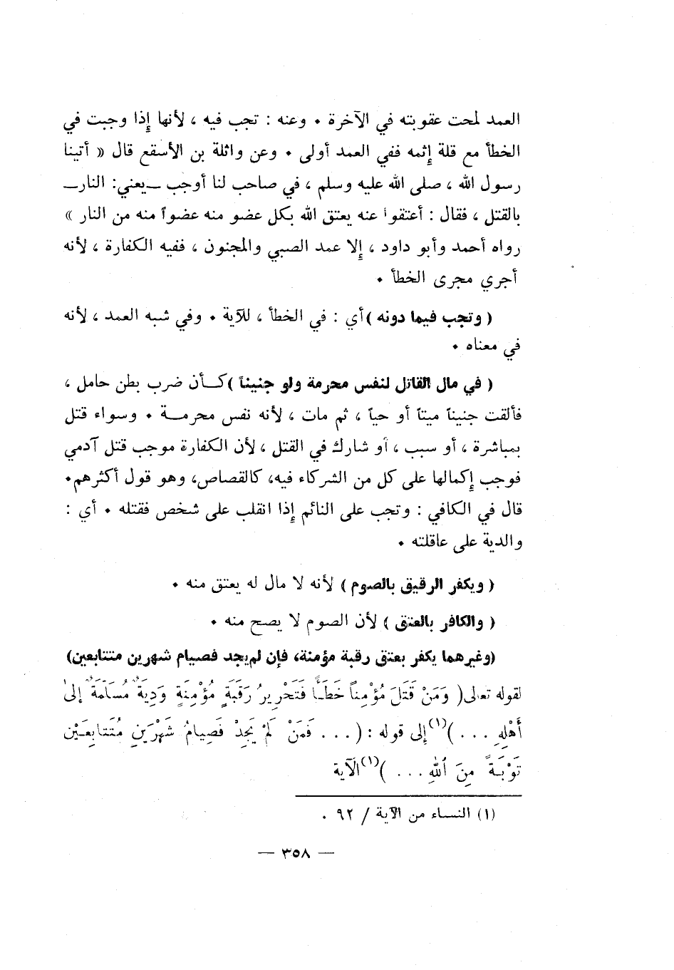 "وغيرهما يكفر بعتق رقبة مؤمنة، فإن لم يجد فصيام شهرين متتابعين" لقوله تعالى: {وَمَنْ قَتَلَ مُؤْمِناً خَطَأً فَتَحْرِيرُ رَقَبَةٍ مُؤْمِنَةٍ وَدِيَةٌ مُسَلَّمَةٌ إِلَى أَهْلِهِ} 1 إلى قوله {فَمَنْ لَمْ يَجِدْ فَصِيَامُ شَهْرَيْنِ مُتَتَابِعَيْنِ تَوْبَةً مِنَ اللَّهِ} 1 الآية.