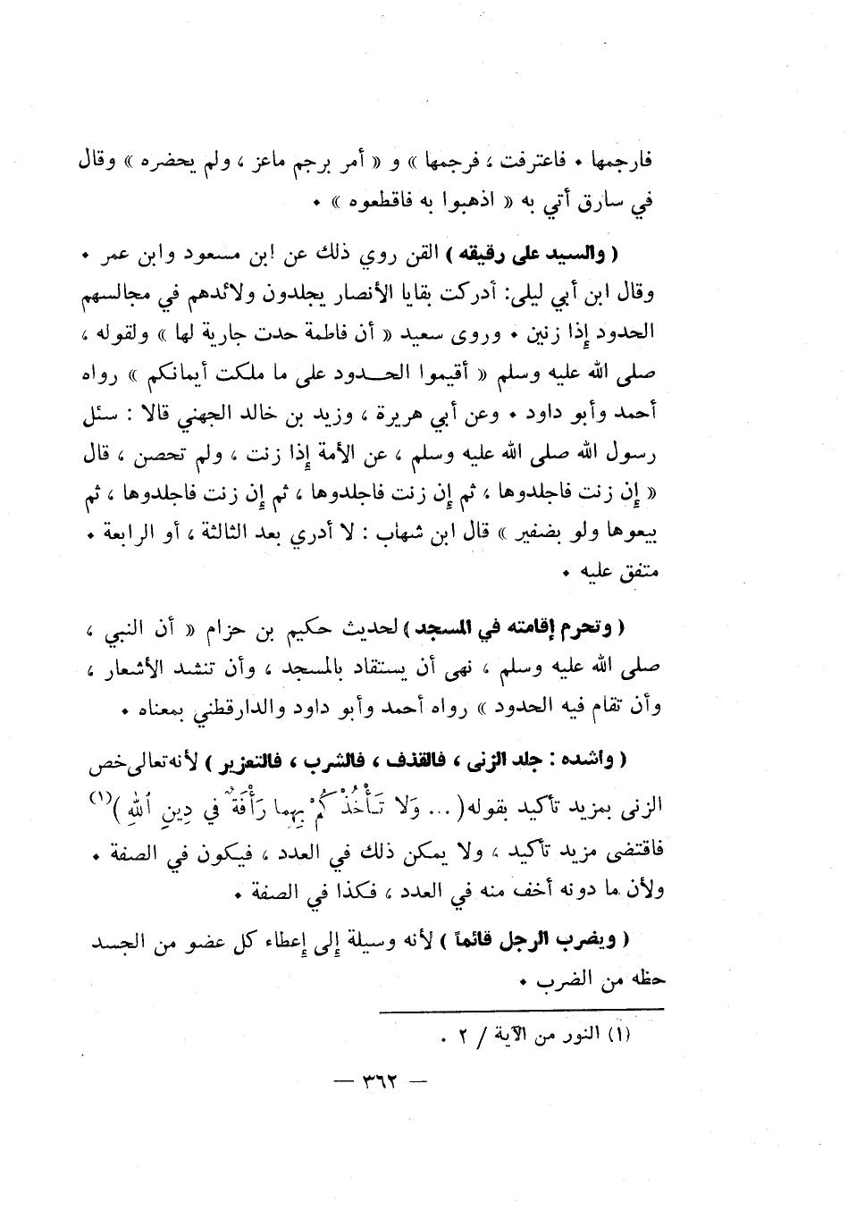 "وتحرم إقامته في المسجد" لحديث حكيم بن حزام: أن النبي صلى الله عليه وسلم، نهى أن يستقاد بالمسجد، وأن تنشد الأشعار، وأن تقام فيه الحدود رواه أحمد وأبو داود والدارقطني بمعناه.