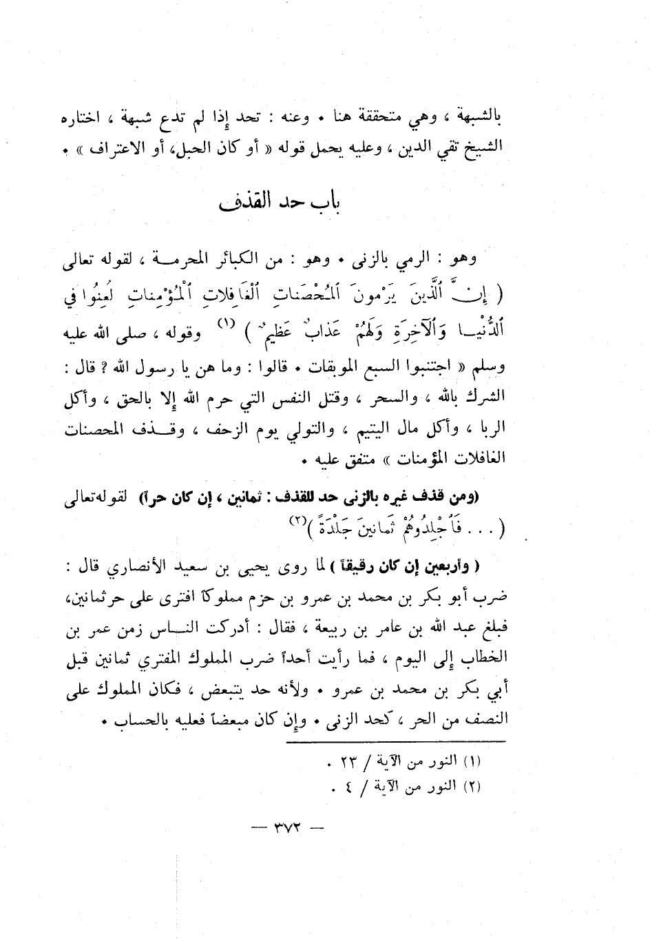 "ومن قذف غيره بالزنى حد للقذف. ثمانين إن كان حرا" لقوله تعالى: {فَاجْلِدُوهُمْ ثَمَانِينَ جَلْدَةً} 2.